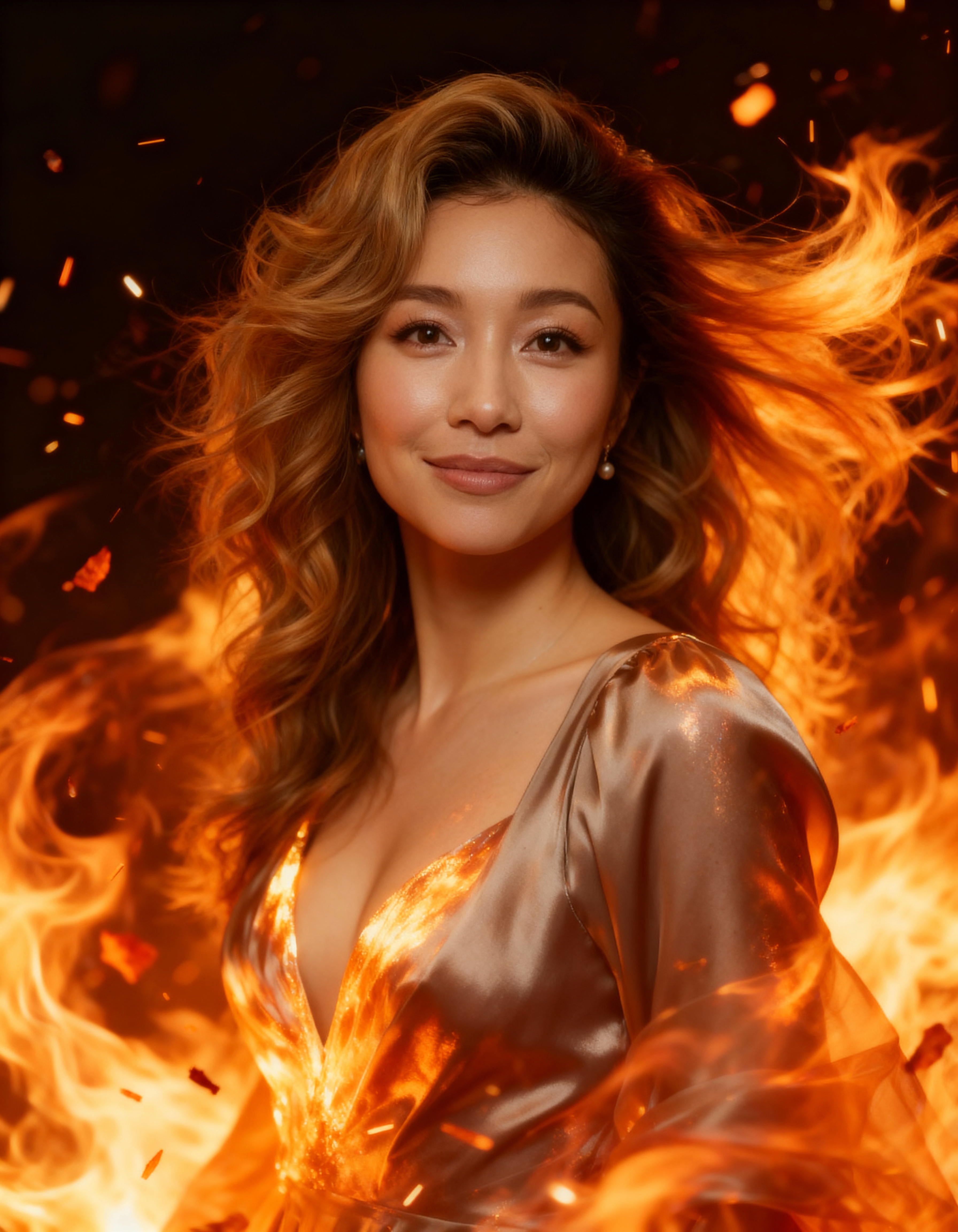 燃えるような背景の前に立つ、長くウェーブのかかった茶色の髪を持つ美しい女性の写実的なポートレート。画像の中央にいる女性は、中くらいの大きさの胸を強調する、大きく開いたネックラインを持つ光沢のあるオレンジ色のドレスを着ています。彼女の茶色の目は視聴者をまっすぐに見つめており、口元には穏やかな笑みが浮かんでいます。彼女の髪は風になびき、背景は鮮やかなオレンジと黄色の炎で満たされ、魅惑的でダイナミックな雰囲気を作り出しています。照明はドラマチックで、女性の特徴と燃えるような背景を強調し、画像をさらに際立たせます。