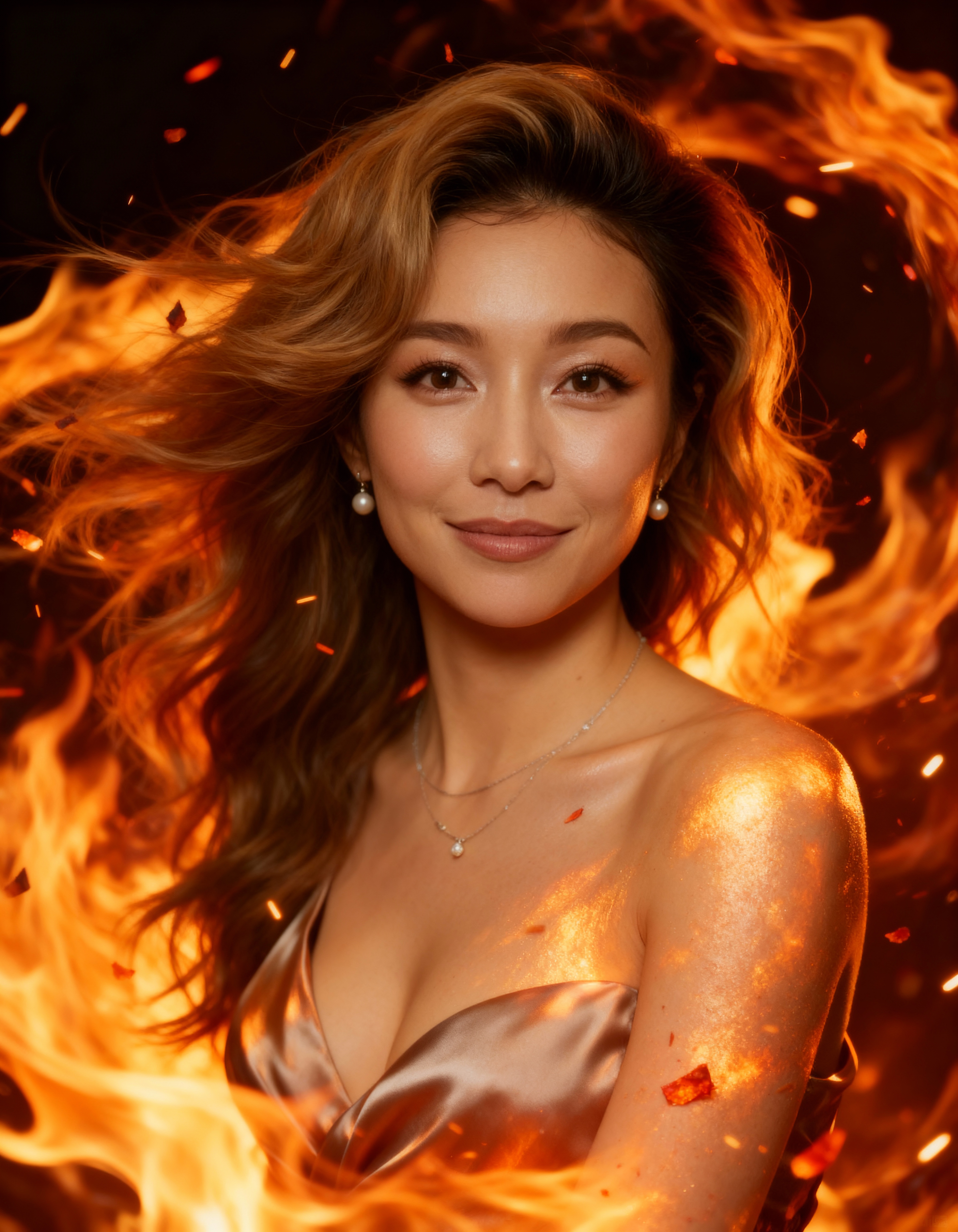 炎と散りばめられた花びらに囲まれた、シルクのようなストラップレスのドレスを着た、ウェーブのかかった茶色の長い髪を持つ美しい女性を、ポートレート カメラ アングルから撮影した写実的なポートレート。画像の中央には、色白の肌、茶色の目、穏やかな笑みを浮かべた20代半ばの女性が写っています。彼女は茶色の目でカメラを直接見ています。彼女の髪はウェーブのかかって背中に流れており、真珠のイヤリングと繊細なネックレスをしています。女性は胸の谷間を強調するストラップレスの絹のようなドレスを着ており、肌にはきらめく効果があります。暗い背景にオレンジと黄色の炎と花びらが散りばめられ、ダイナミックで魅惑的な雰囲気を作り出しています。