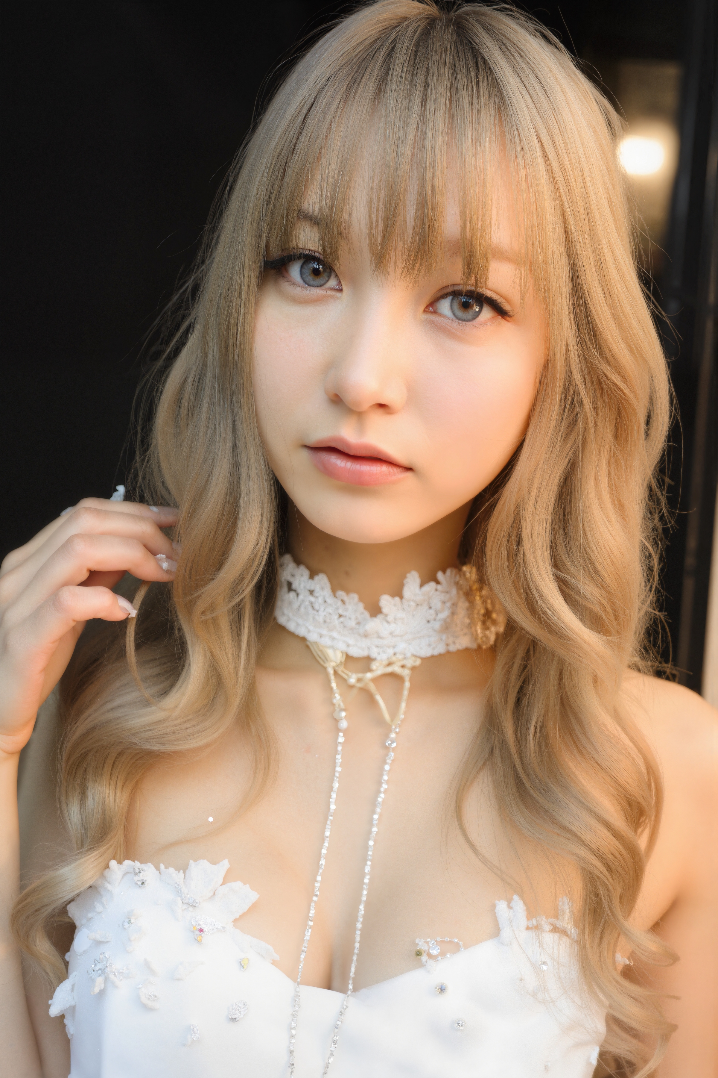 クローズアップカメラの角度から撮影された、長くウェーブのかかったブロンドの髪と印象的な青い目をした若い女性の写実的なポートレート。女性は10代後半か20代前半に見え、肌は白く、中性的な表情をしている。彼女は、複雑なレースのディテールが施された白いウェディングドレスと、パールが付いた繊細なチョーカーを着ています。彼女の髪はゆるやかなウェーブに整えられ、背中に流れて顔を縁取ります。彼女の目は視聴者をまっすぐに見つめており、口元にはわずかな笑みが浮かんでいます。背景はぼやけていますが、柔らかな照明が照らされた屋内の設定のようで、暖かく居心地の良い雰囲気を作り出しています。全体的な雰囲気は柔らかく穏やかで、優雅さと洗練の感覚を呼び起こします。