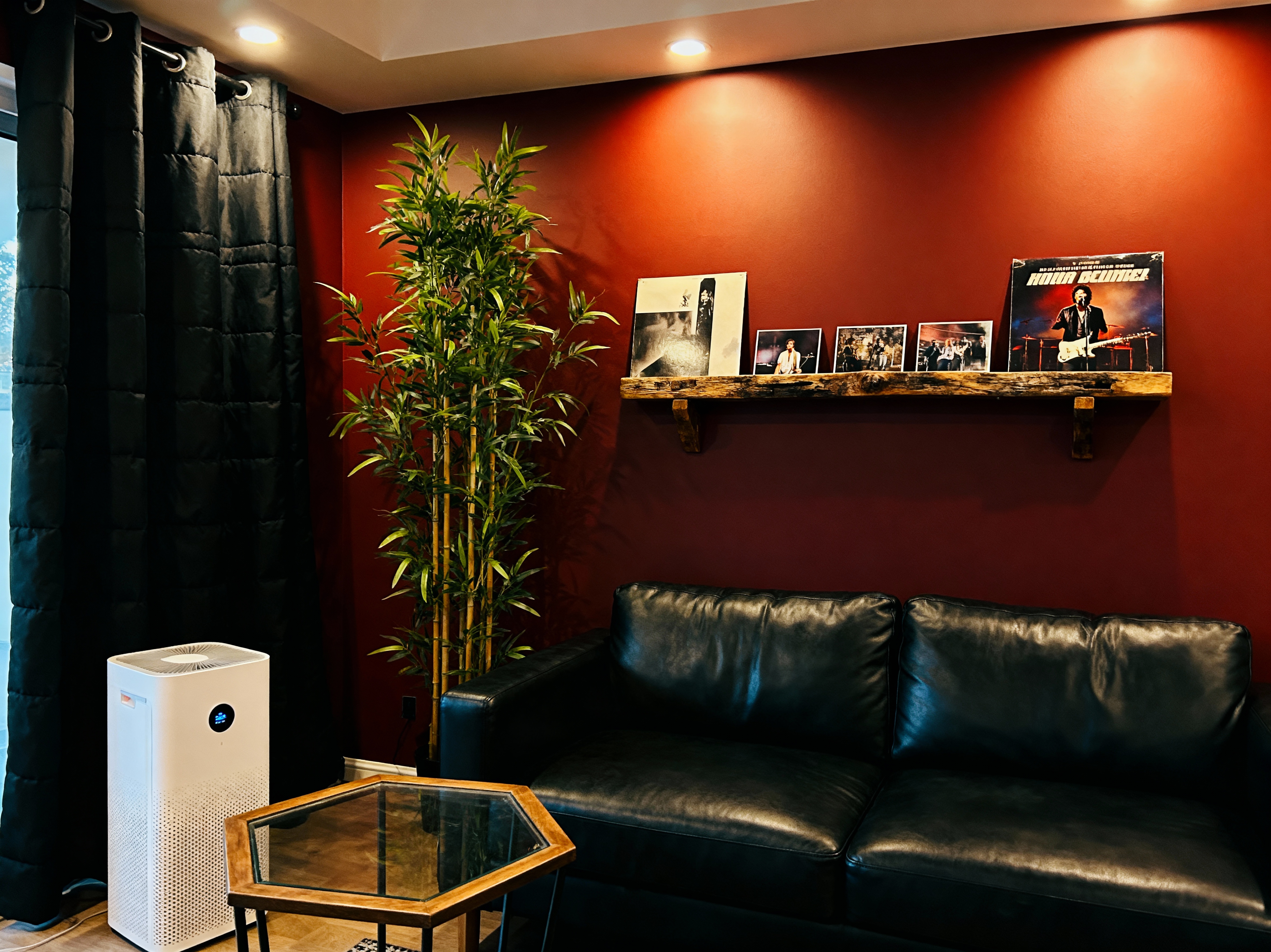 ミニマルなデザインのモダンなリビング ルーム。部屋の左側に黒い革張りのソファ、木製のコーヒー テーブル、白い空気清浄機が置かれています。壁は深い赤色で塗られており、壁には木製の棚が取り付けられており、写真が数枚飾られています。右側には背の高い緑の竹が壁際に置かれ、単色の空間に緑のタッチを加えています。部屋は埋め込み型の照明で照らされ、暖かく魅力的な雰囲気を作り出しています。ソファが画像の中心であり、コーヒーテーブルは座って写真を鑑賞する場所を提供します。