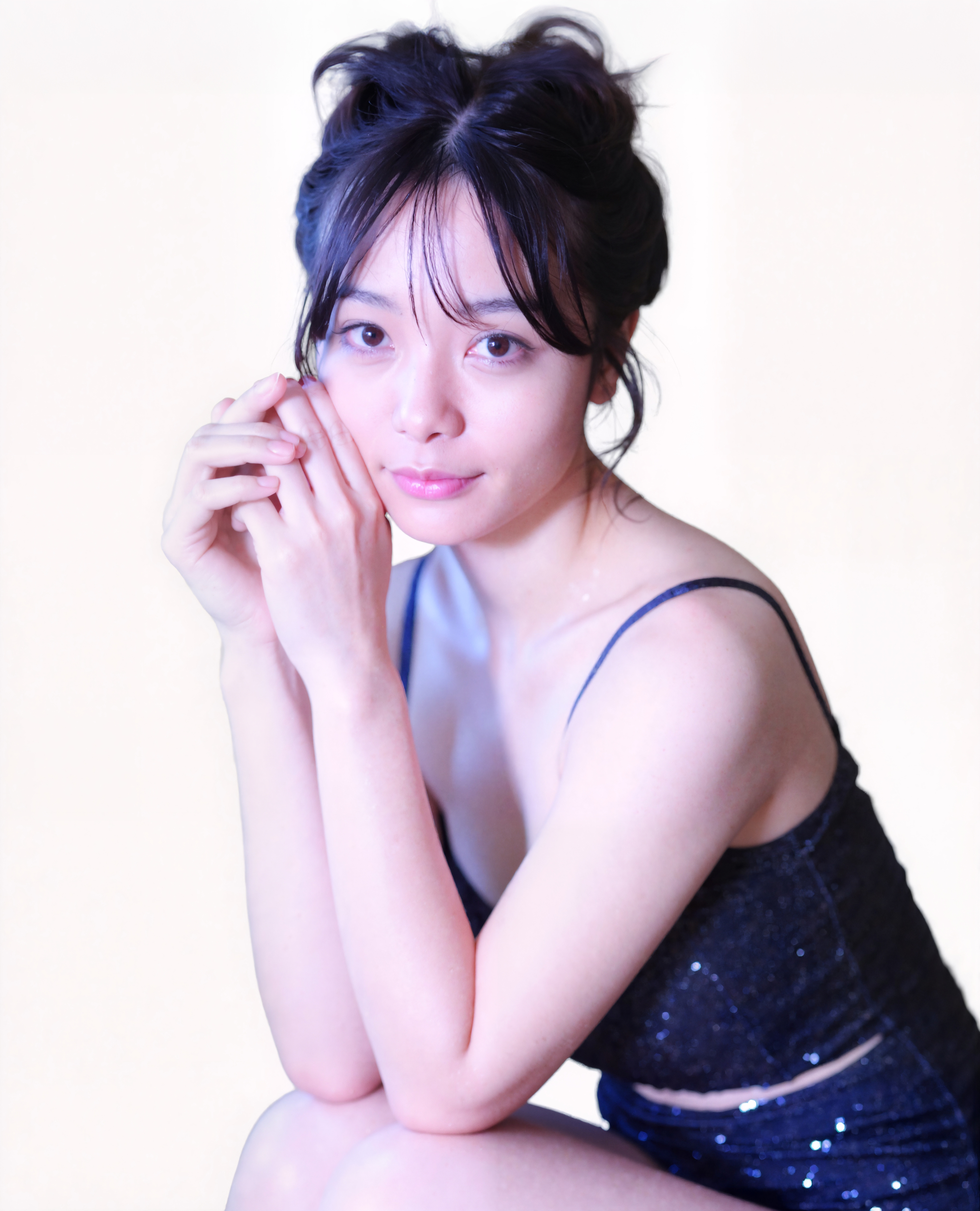 ネイビーブルーのスパンコールのトップを着て、瞑想的なポーズで床に座る若いアジア人女性の写実的なポートレート。その女性は10代後半か20代前半と思われ、色白で、乱れたお団子にまとめられた黒髪を持ち、わずかな笑みを浮かべてカメラを直接見つめている。彼女は顔の前で両手を組み、最小限の化粧をしており、ほおにはほんのり赤みを帯びています。照明は柔らかく自然で、彼女の肌に優しい輝きを生み出し、背景は真っ白な壁です。女性の顔と上半身に焦点を当てたクローズアップの視点で撮影されているため、どの部分の表情が正しいのか判断するのが困難です。全体的な効果は静けさと瞑想のようなものです。