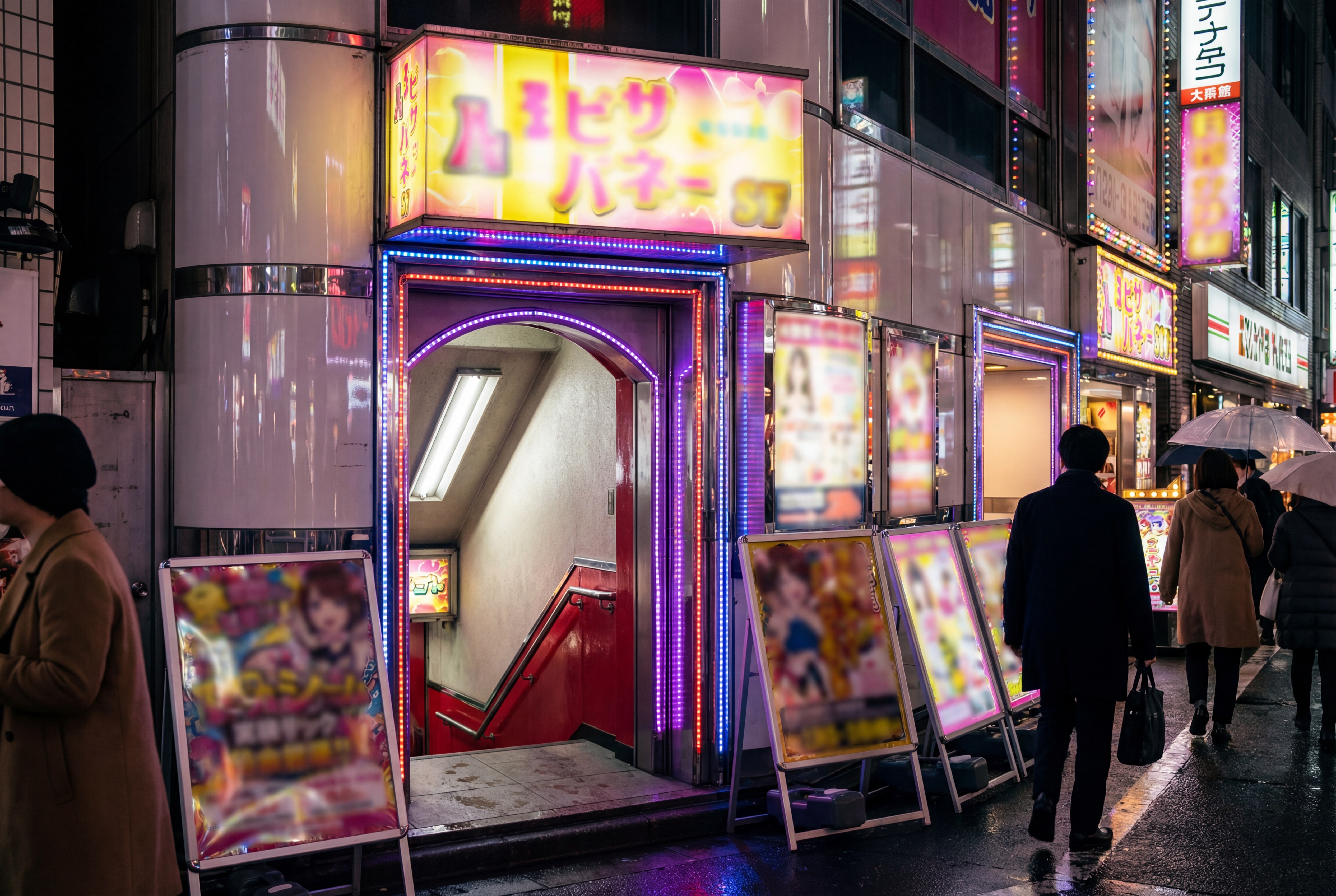 日本の東京の雨の夜景を写実的に描写したもので、ネオンが輝くコンビニエンスストアの入り口が特徴的です。エントランスはカラフルなネオンサインや広告で明るく照らされ、活気に満ちた雰囲気を作り出しています。前景では、男性が画像の中央に一人で立っており、雨から身を守るために傘をさしています。彼は黒いコートを着て黒いバッグを持っており、その左側に立っている女性は茶色のコートを着てコーヒーを持っています。彼の右側では、人々のグループが歩道を歩いており、中には雨から身を守るために傘をさしている人もいた。背景には、高層ビルや広告が横にある喧騒の街並みが描かれています。全体的な雰囲気は暗く不機嫌で、ネオンの光が建物の落ち着いた色や濡れた舗道に対して鮮やかなコントラストを生み出しています。