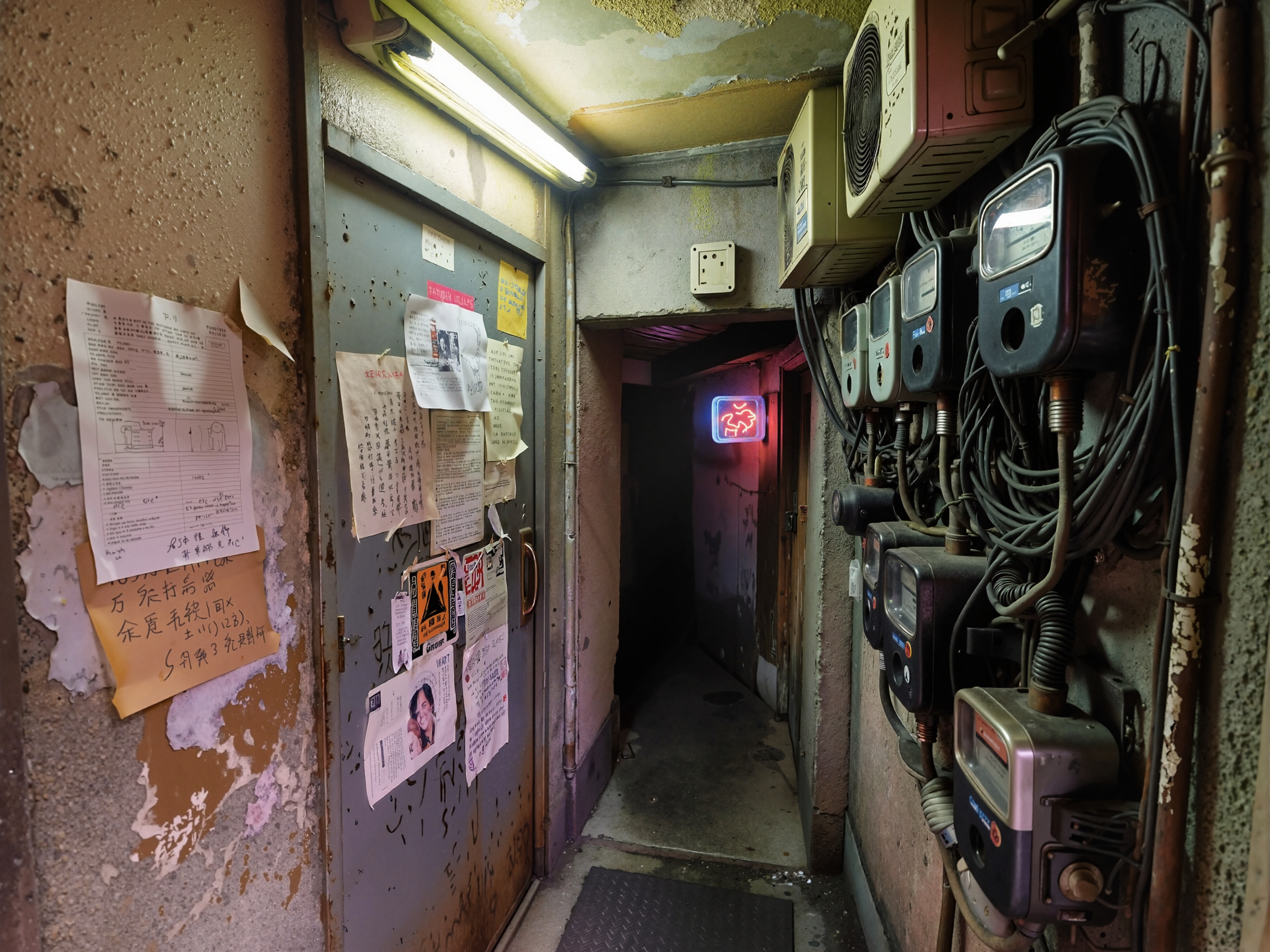 廃ビルの薄暗い廊下。塗装が剥がれ、さまざまな電気機器や紙が壁に貼り付けられている。廊下は狭く、素朴なインダストリアルな雰囲気が漂います。廊下の左側にはいくつかの電気メーターと配線があり、右側にはエリアを照らす蛍光灯があります。壁は剥がれ落ち、床は土と汚れで覆われています。背景には、廊下につながる赤い出口標識のあるドアが見えます。画像全体の雰囲気は不気味で無視されており、放棄と無視の感覚があります。