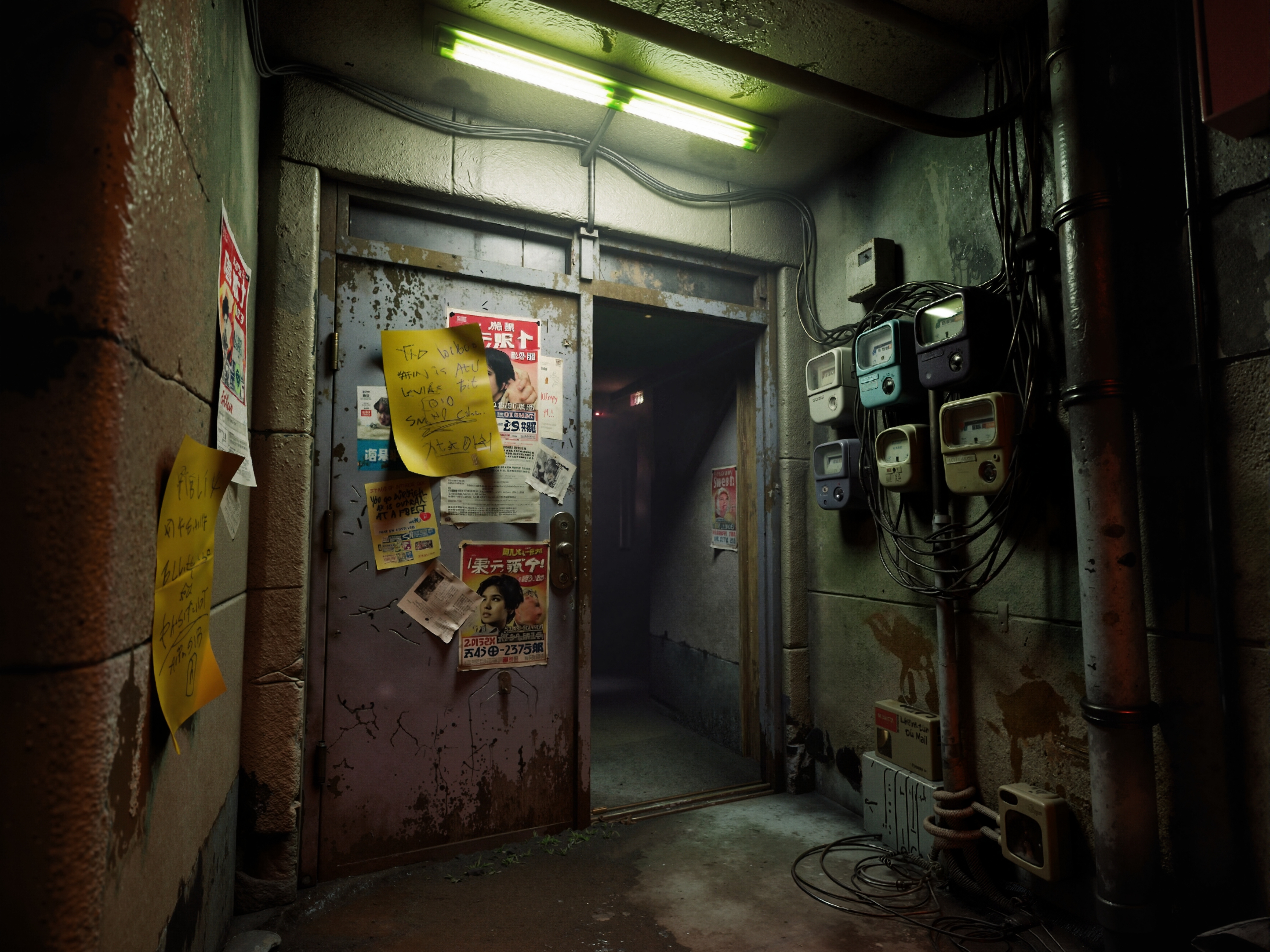 薄暗く、錆びた金属のドアとポスターが貼られたインダストリアルな廊下。廊下には塗装が剥がれたコンクリートの壁があり、電線がそれに沿って走っています。廊下の右側の壁には数メートルが取り付けられており、左側のドアには黄色い付箋が貼り付けられています。ドアの上では、緑色の蛍光灯が現場を照らし、ポスターに暖かい光を投げかけます。画像全体の雰囲気は不気味で不気味で、謎とサスペンスの感覚を伴います。