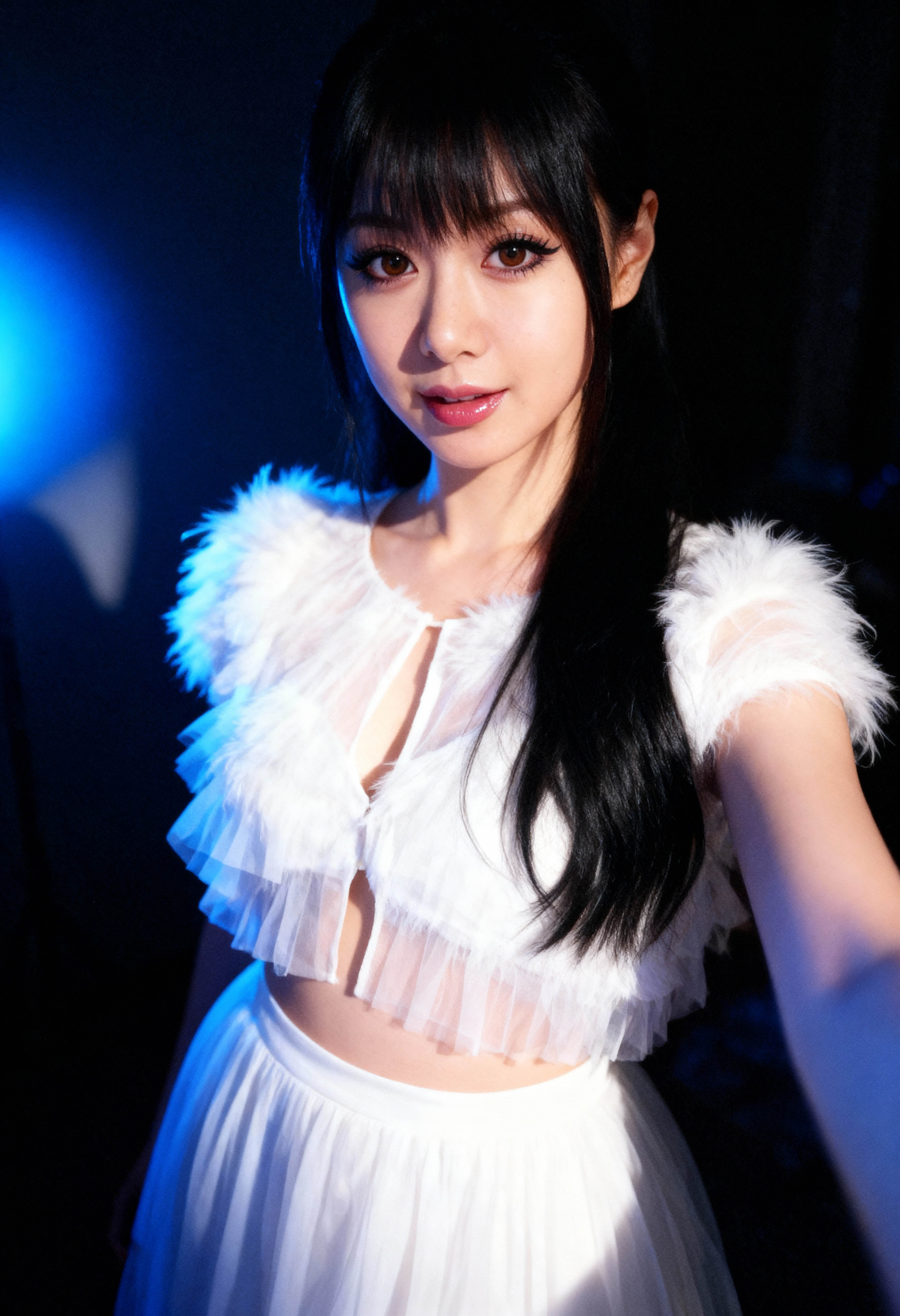 青い光源を背景にセルフィーを撮る若い女性をポートレートアングルから撮影した写実的な写真。画像には、長くまっすぐな黒髪と茶色の目をした若いアジア人女性が、毛皮のトリムが付いた薄手の白いクロップトップと白いチュールスカートを着ているのも写っている。彼女は画像の中央に立って、中立的な表情でカメラをまっすぐに見つめています。彼女の髪は、前髪が顔を縁取るストレートでストレートな外観にスタイリングされています。彼女の目は大きく茶色で、口元にはかすかに笑みを浮かべています。照明は柔らかくドラマチックで、彼女の顔と上半身に焦点を当てています。背景は青みがかった暗い色で、ムーディーな雰囲気を作り出しています。
