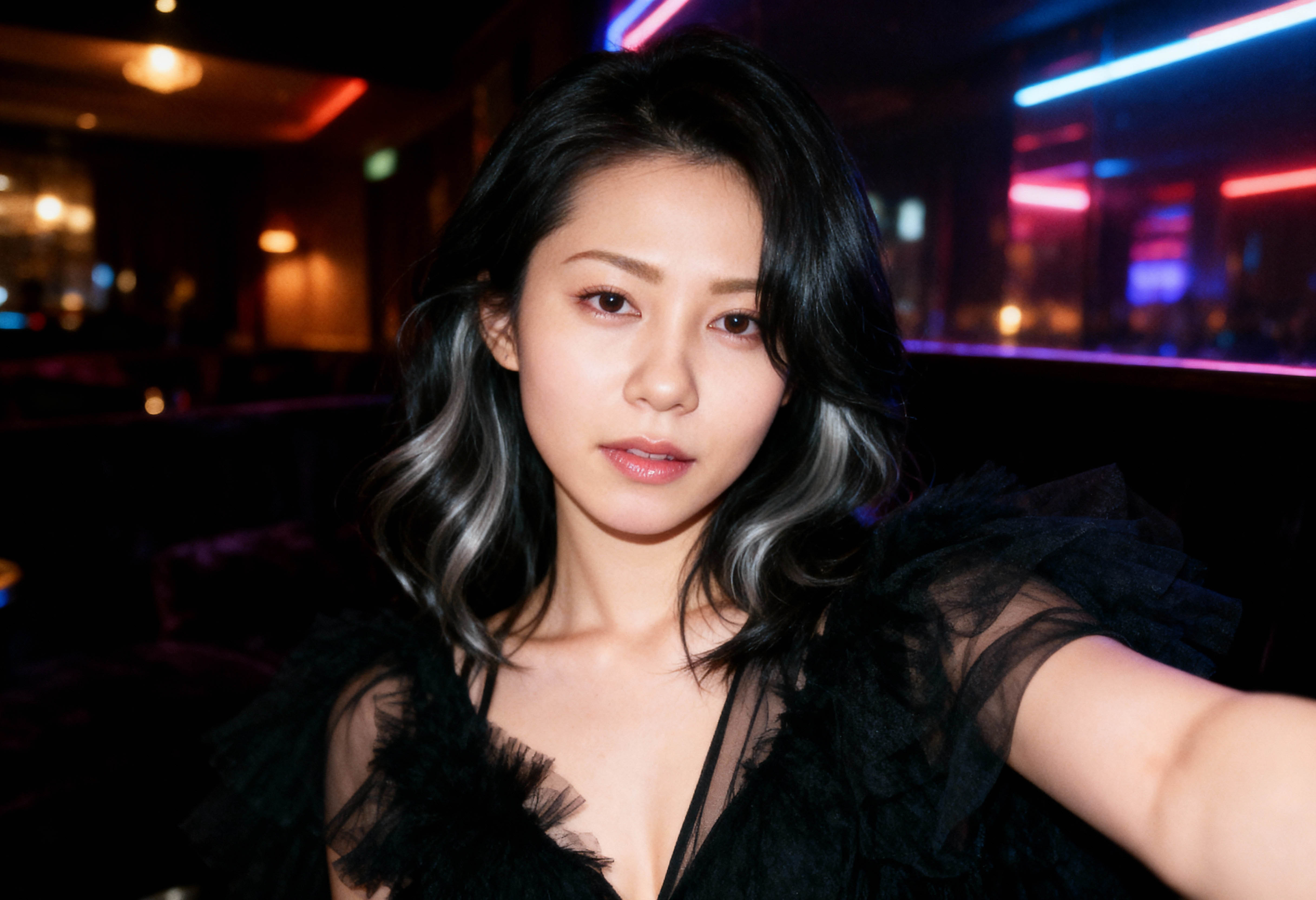 ネオンライトを背景に薄暗いナイトクラブで自撮りをする若い女性のポートレート。 10代後半から20代前半と思われる女性は画像の中央に位置し、上半身がカメラに向かい、中立的な表情で視聴者をまっすぐに見つめています。彼女は銀色のハイライトが付いたウェーブのかかった長い黒髪を持ち、茶色の目はカメラをまっすぐに見つめています。彼女は、胸の谷間が見える大きく開いたネックラインの黒い羽飾りのドレスを着ており、肩には黒い毛皮のストールが掛けられています。彼女の唇は柔らかいピンク色に塗られており、顔にはわずかに笑みが浮かんでいます。照明は柔らかく温かみがあり、夢のような雰囲気を作り出し、背景がぼかされ、色とりどりのネオンライトがシーンを照らします。