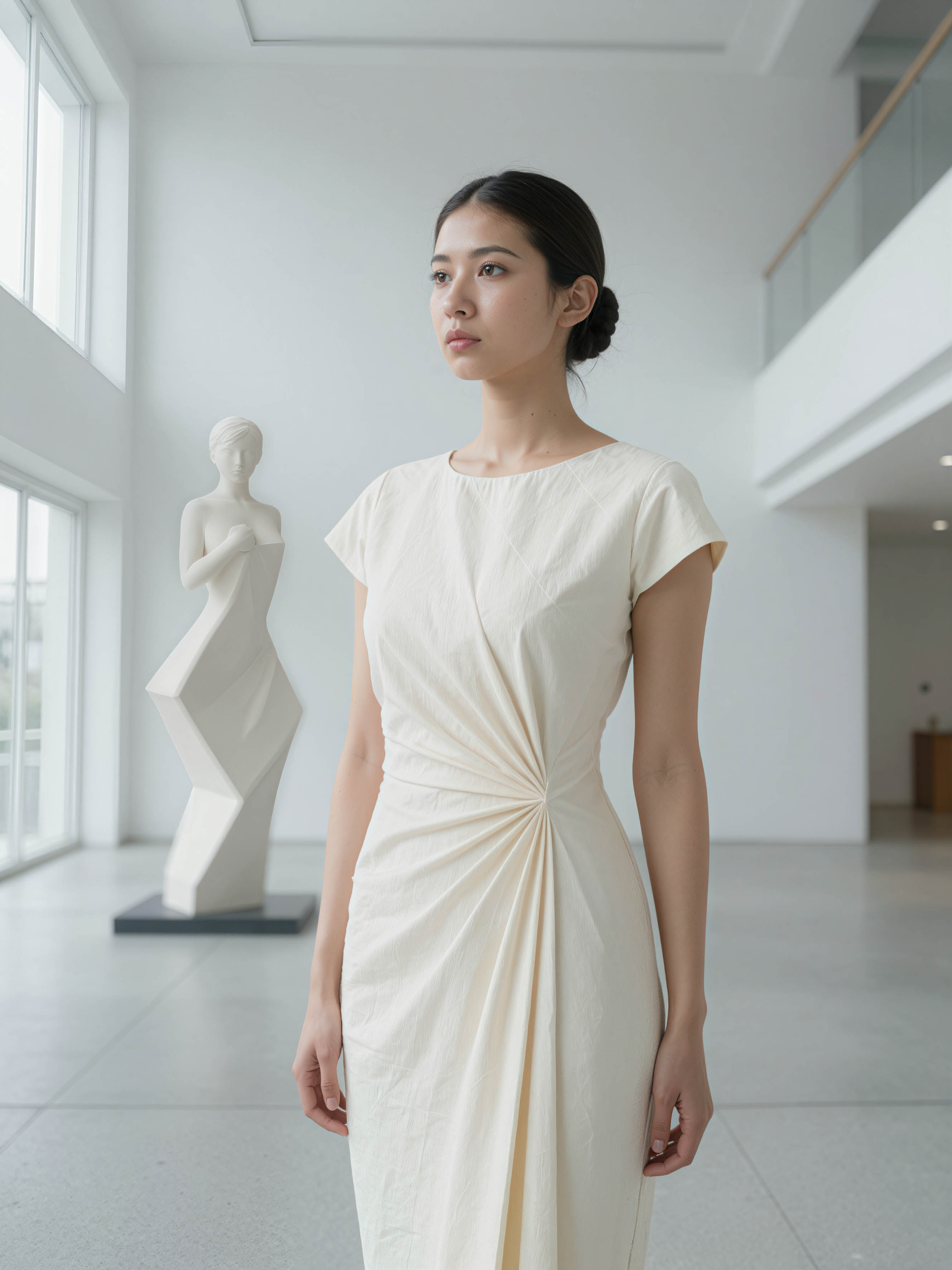 結び目のディテールが施された白いドレスを着てアート ギャラリーに立つ若い女性を横顔カメラのアングルから写実的に撮影したもの。画像には、白い壁、大きな窓、背景の彫刻を備えたミニマルなインテリアも示されています。画像の中央には、色白の肌と黒髪をひとつにまとめた19歳のアジア人女性が両手を前に組んで立ち、中立的な表情でカメラをまっすぐに見つめている。彼女は10代後半から20代前半に見え、ほっそりした体格と繊細な顔をしています。彼女のドレスは軽くて質感のある生地で作られており、前面に結び目のディテールがあり、ユニークでエレガントな外観を与えています。女性は最小限のアクセサリーを身に着けており、姿勢は自信に満ち、落ち着いています。画像内の照明は柔らかく自然で、彼女の繊細な特徴とドレスの質感を強調しています。