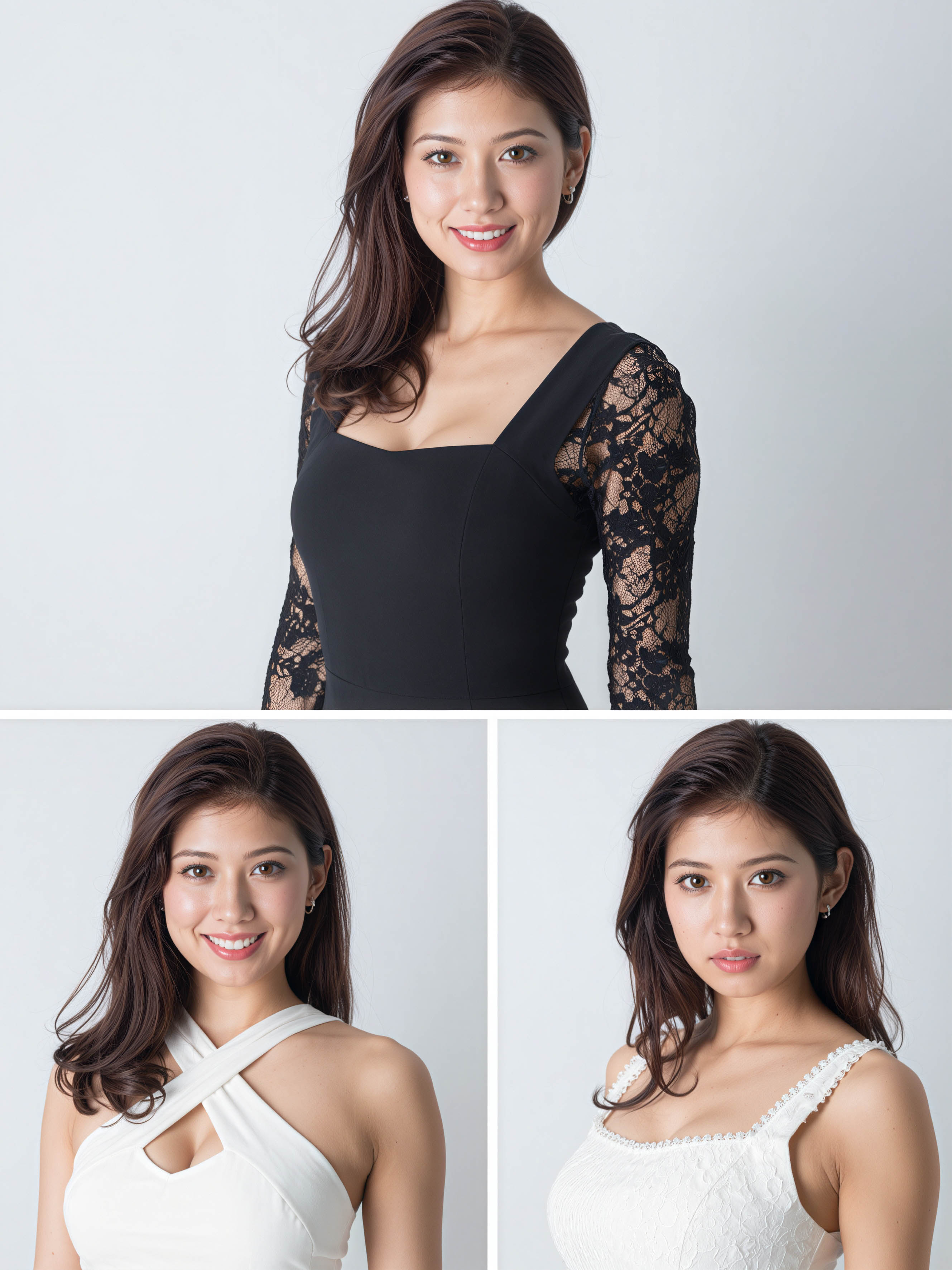 4 つの異なる角度からプロが顔写真を撮影し、異なる表情を持つ若い女性の 4 つのポートレートのコラージュを紹介します。 左上の写真では、黒いレースの袖のドレスを着た長い茶色の髪の20歳の女性が画像の中央に立って、自信に満ちた笑顔でカメラをまっすぐに見つめています。彼女は10代後半から20代前半に見え、顔にはかすかに笑みを浮かべています。彼女の髪はゆるやかなウェーブで背中に流れ、顔を完璧に縁取っています。彼女の目は明るい茶色で、最小限の化粧をしています。彼女の体はスリムで引き締まっており、姿勢は自信に満ちていてリラックスしています。右上の写真では、彼女は黒いレースの袖と彼女の体型を強調する黒いドレスだけを着て腕を横に組んで立っています。彼女の表情は中性的で、目は見る人をまっすぐに見つめ、唇はわずかに開いており、遊び心と魅力的な雰囲気を醸し出しています。 同じ女性の左下の写真と、下の右の写真では、ネックラインが交差した白いノースリーブのドレスを着ており、裸の肩と中くらいの大きさの胸が見えています。彼女はまた、レースのディテールが施された白いドレスを着ており、髪はルーズでストレートな外観にスタイリングされています。彼女の目、鼻、口などの顔の特徴がはっきりと見えます。写真の背景は無地のライトグレーで、彼女のドレスのニュートラルな色調とうまく対照的で、画像をさらに際立たせています。