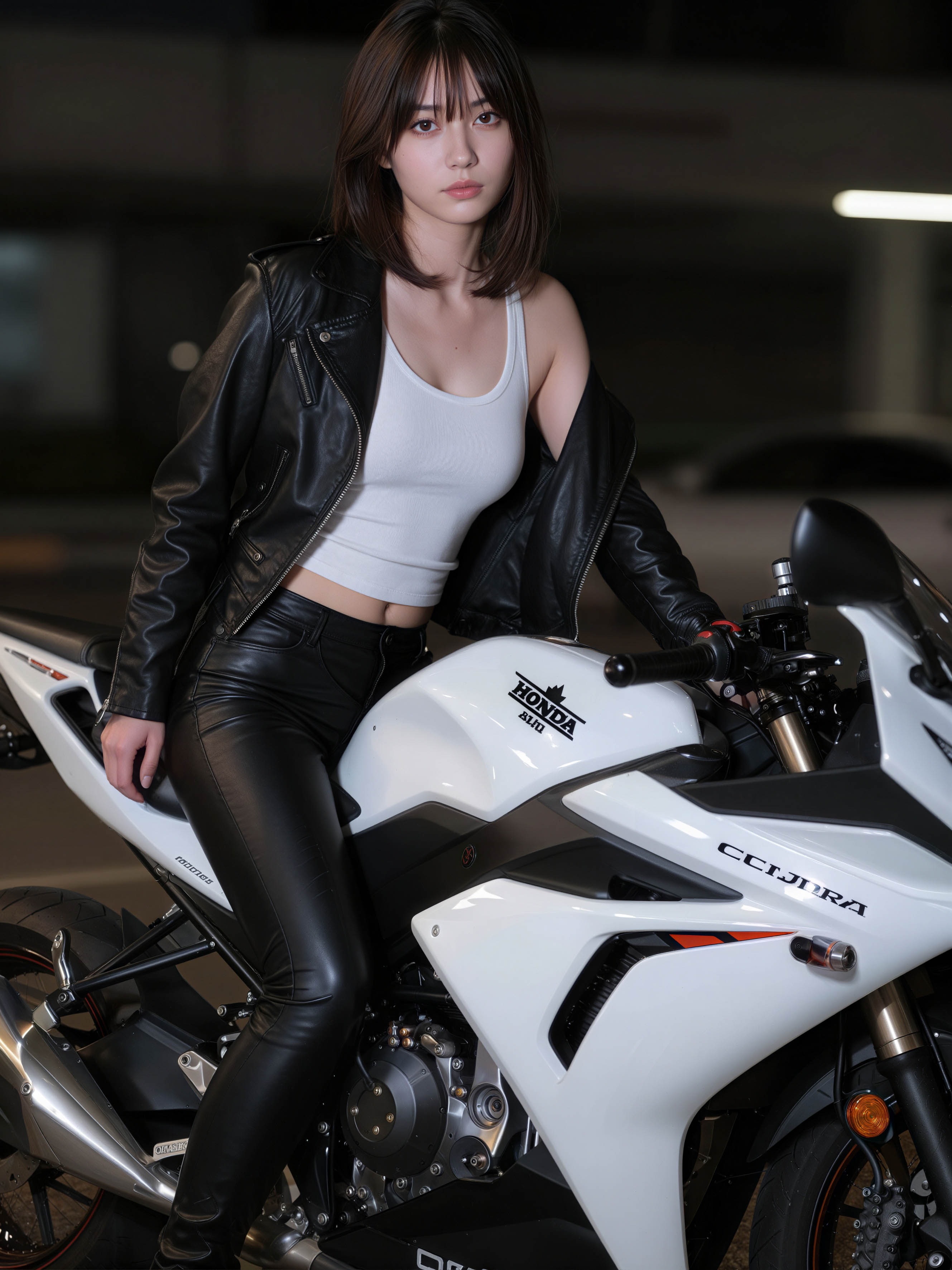 薄暗い駐車場で白いバイクに座っている若い女性を正面から写実的に撮影した写真。画像には、クロップド丈の白いタンクトップと黒いレザージャケットも写っています。画像の中央には、濃い茶色の短い髪をした20歳のアジア人女性がバイクに座っているように見えます。彼女は真剣な表情でカメラをまっすぐに見ています。彼女の体はスリムで、黒い革のパンツを履いています。バイクはホンダ CBR1000RR で、側面に会社のロゴと名前が書かれています。背景がぼやけていますが、薄暗い照明の屋内駐車場のようです。