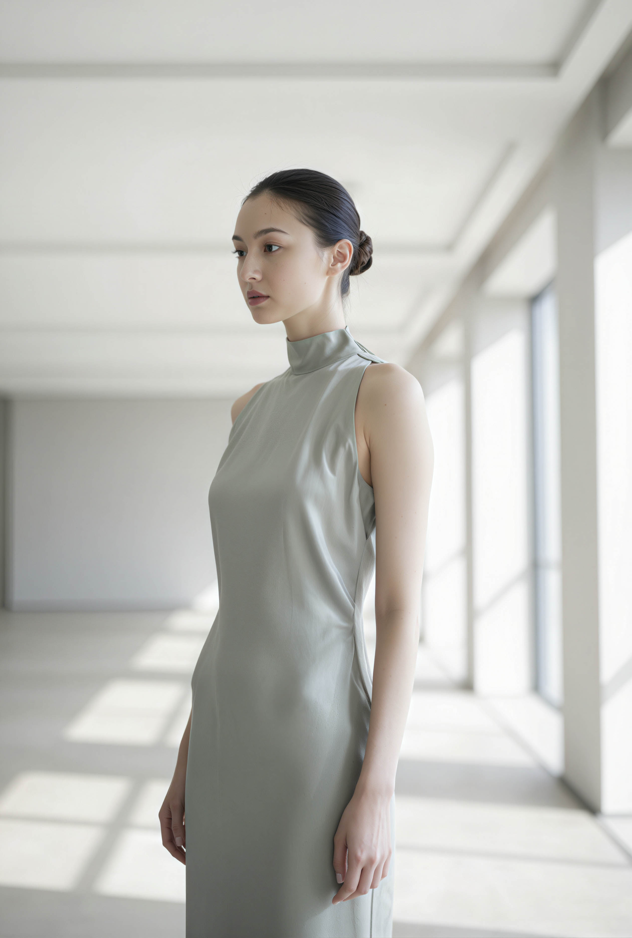 大きな窓のある空の部屋に立つ、ライトグレーのシルクドレスを着た若い女性を横顔カメラのアングルから写実的に撮影したもの。この画像には、白い壁と自然光が入る大きな窓を備えたシンプルなインテリアも示されています。画像の中央には、白い肌と黒い髪を一つにまとめた20歳のアジア人女性が、中性的な表情で視聴者に向かって立っているように見えます。彼女は、スリムな体型を強調する、ノースリーブのハイネックのライトグレーのドレスを着ています。ドレスは滑らかでシルキーな素材で作られており、控えめな光沢があり、高級感があります。女性は髪をきちんとお団子状に結び、片手を腰に当て、もう一方の手を太ももに当てて立っています。彼女の姿勢は自信と落ち着きがあり、体をわずかに横に向けています。