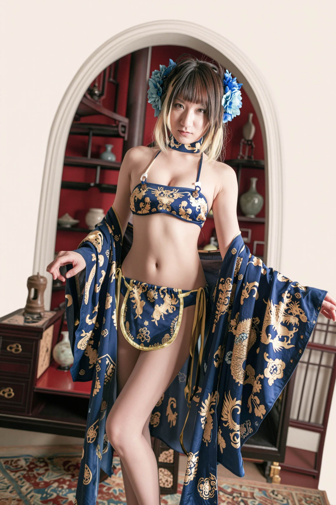 伝統的な東洋の雰囲気の中で、青と金の柄のビキニとそれに合わせた着物を着た若い女性を全身カメラ アングルから写実的に撮影したものです。画像の中央には、白い肌とほっそりとした体格をした17歳のアジア人女性が、片手を腰に、もう一方の手を太ももに当てて自信満々に立ち、中立的な表情でカメラをまっすぐに見つめている。彼女は前髪のある長いストレートのブロンドの髪を持ち、髪には青い花があり、顔を縁取るようにスタイリングされています。彼女の体はスリムで引き締まっており、金色の花柄が入った青いビキニトップを着ており、金色の柄が入った青い着物を合わせています。女性は赤い壁と花瓶のある木製キャビネットを背景にしたアーチ道の前に立っていて、部屋に優雅さを加えています。照明は柔らかく自然で、暖かく居心地の良い雰囲気を作り出しています。