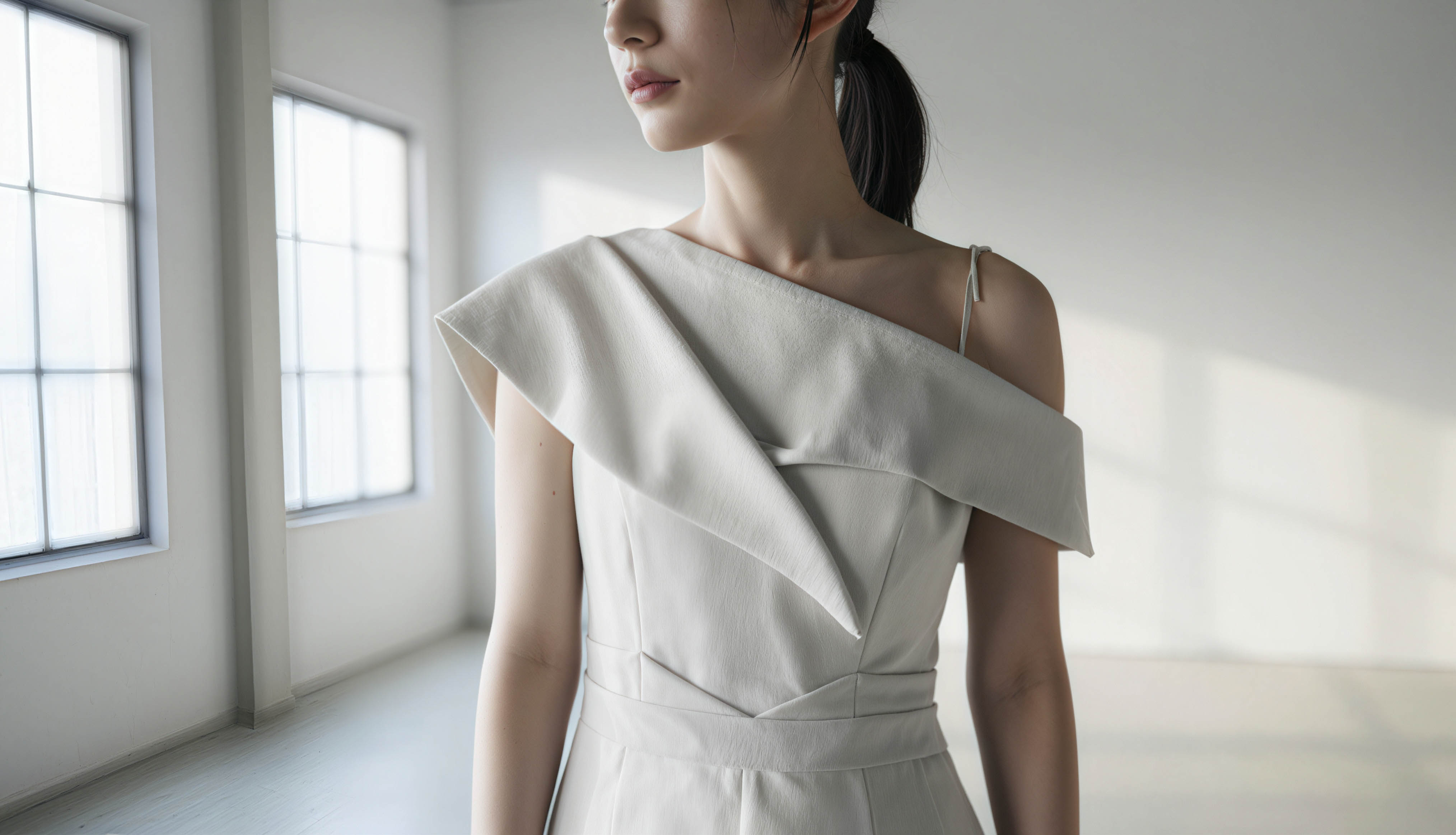 大きな窓のある空の部屋に白いドレスを着た女性が立っている様子を、横顔カメラのアングルから写実的に撮影したもの。この画像には、白い肌とポニーテールに結んだ長い黒髪の若い女性が、カメラに背を向けて画像の中央に立ち、見る者から背を向けている様子も映っている。彼女は深いVネックラインと細いストラップが付いた白いオフショルダードレスを着ています。ドレスはフィット感があり、ウエストがフィットしており、彼女の細い体格を強調しています。女性は10代後半か20代前半に見え、顔には中性的な表情を浮かべている。髪はきちんと整えられ、自然光が差し込む大きな窓の前に立つ彼女は、明るく開放的な雰囲気を醸し出している。部屋は白い壁と木の床というミニマルなデザインで、柔らかく自然な照明が女性の顔や体に優しい影を落としています。