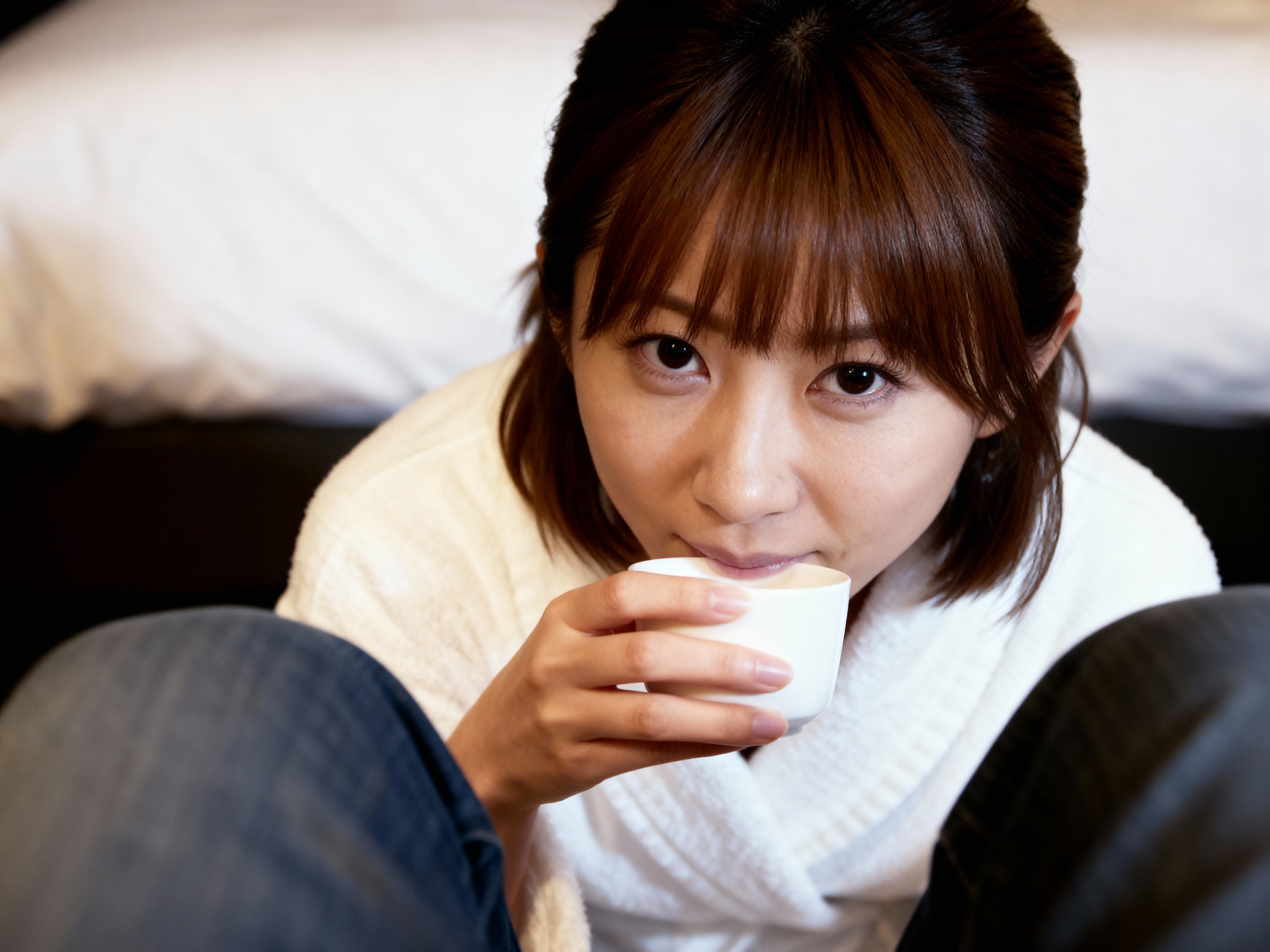 ソファに座り、手に白いカップを持ち、瞑想的な表情でカメラを直接見つめている若い女性の接写。彼女は10代後半から20代前半に見え、色白で、前髪のあるショートボブカットに整えられたダークブラウンの髪をしています。彼女の目は大きく見開かれており、肩に掛けられた白いローブを着ています。背景はぼやけていますが、ベッドと枕が見える居心地の良いリビングルームの設定のようです。照明は柔らかく自然で、暖かく親密な雰囲気を作り出しています。女性は画像の中央に座っており、足を少し開いて、顔の前でカップの周りに手を握っています。