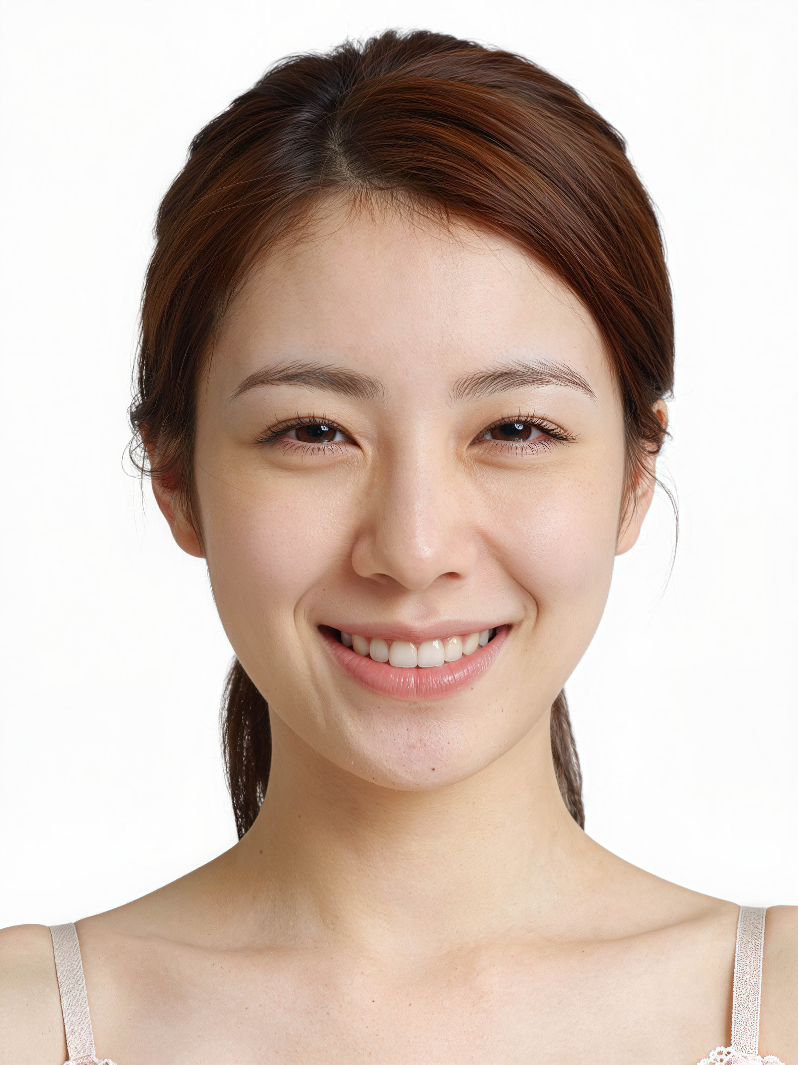 明るい表情で、わずかな笑みを浮かべて視聴者をまっすぐに見つめている若い女性のクローズアップのポートレート。彼女は10代後半か20代前半に見え、肌は白く、二つ三つ編みにした茶色の髪をしている。彼女の目は大きく茶色で、裸の肩と鎖骨を強調する白いレースのブラジャーを着ています。彼女の唇はわずかに開いており、明るく白い笑顔を見せており、眉毛は完璧に整えられ、埋められています。背景は無地の白で、ポートレートに清潔でさわやかな背景を提供しています。照明は柔らかく自然で、彼女の繊細な顔立ちと滑らかな肌の質感を強調しています。画像全体の雰囲気は明るくて魅力的で、喜びと幸福感を伝えます。