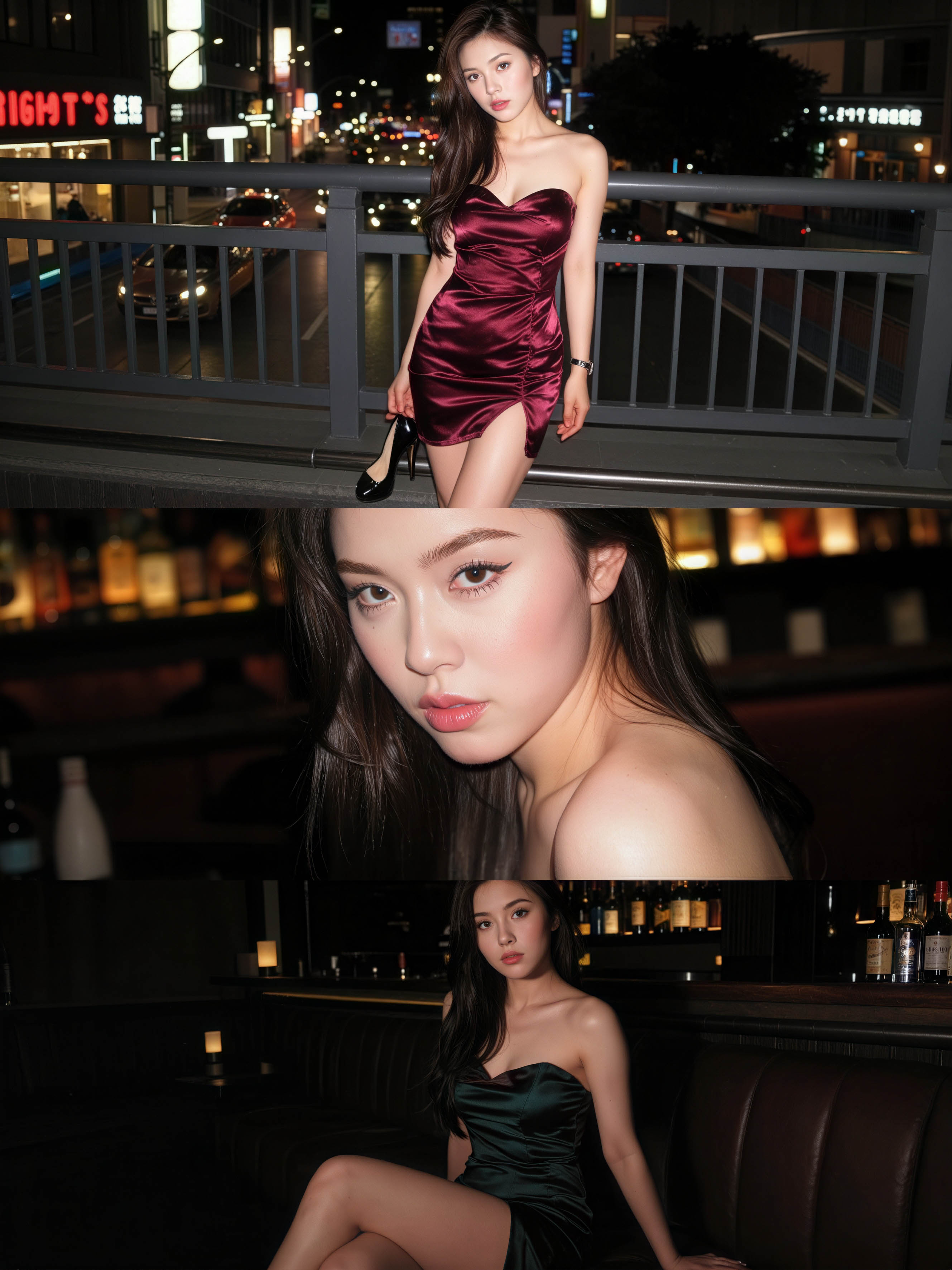 ストラップレスのワインレッドのサテンのドレスを着て、夜の豪華な環境でポーズをとる若い女性を、トップダウンの視点から写実的に撮影したもの。この画像には、ネオンと車が背景にある街並みも示されています。左上では、女性は遠くに街のスカイラインを望むバルコニーに立っています。彼女は長くてストレートなダークブラウンの髪を持ち、中性的な表情でカメラをまっすぐに見つめています。彼女の目は茶色で、体はスリムです。彼女は、彼女の曲線を強調するタイトなストラップレスのワインレッドのベルベットのドレスを着ており、黒いハイヒールと組み合わせられています。彼女の髪は顔を縁取るように整えられており、足を組んでソファに座っています。画像の中央で、彼女は腰に手を当てて立ち、茶色の目で視聴者をまっすぐに見つめています。彼女の表情は無表情で、唇にはほんのり赤い口紅が塗られています。