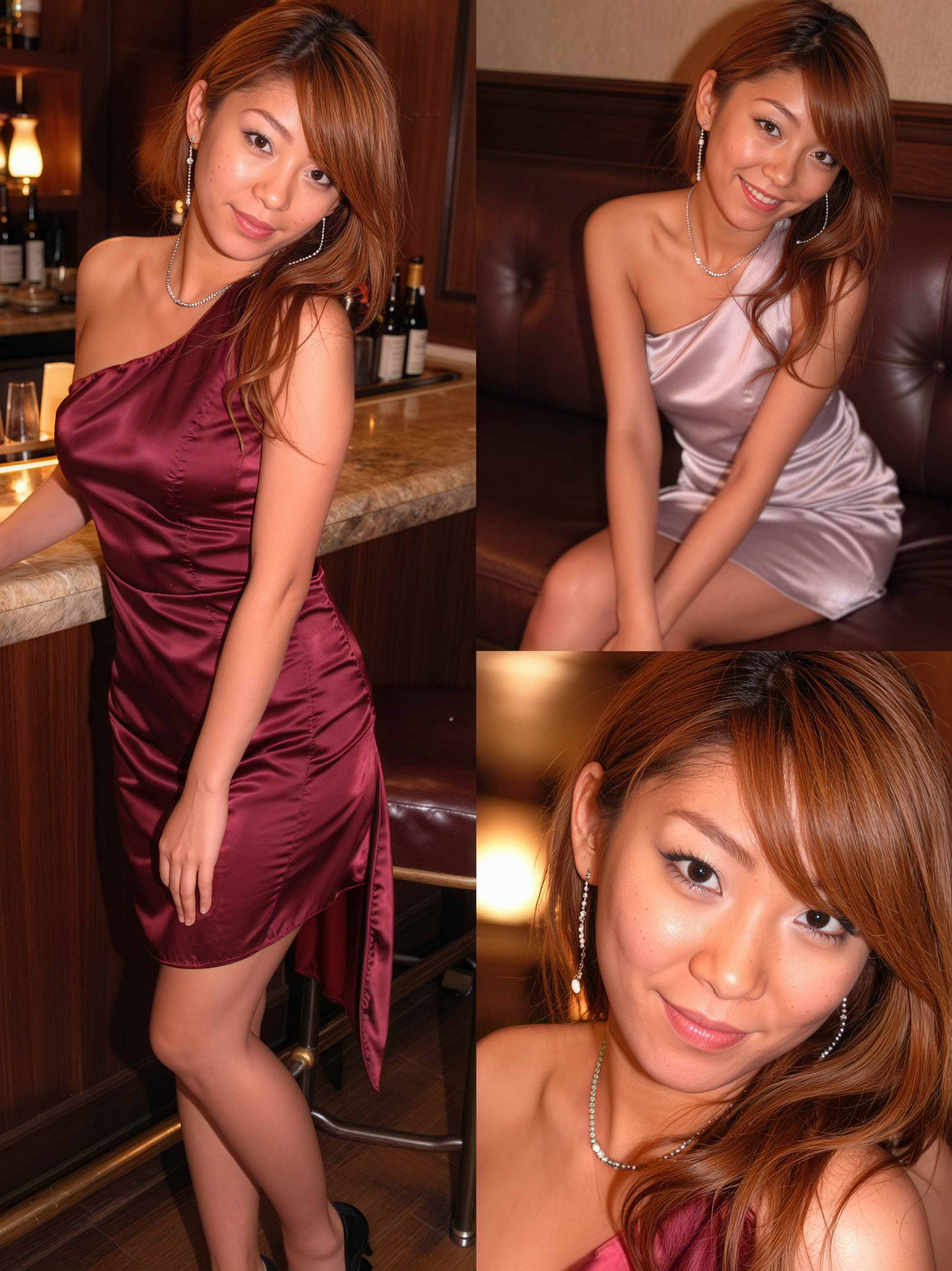薄暗いバーの中でポーズをとる若い女性をフィーチャーした4枚の写真のコラージュ。左側の最初の写真は、サイドにスリットが入ったマルーン色のサテンのワンショルダードレスを着てバーカウンターに立ち、顔にかすかな笑みを浮かべて自信満々にポーズをとっている女性を示しています。彼女の長い茶色の髪は背中に流れ、銀のイヤリングと繊細なネックレスを着けています。右上の 2 番目の写真も同じ女性ですが、革製のソファに足を組んで座っており、遊び心のある表情でカメラを直接見つめています。 3枚目の写真は右下隅に彼女を写しており、4枚目の写真は彼女の顔をよく見て、ほおにそばかすが少しある彼女の自然な美しさを示しています。