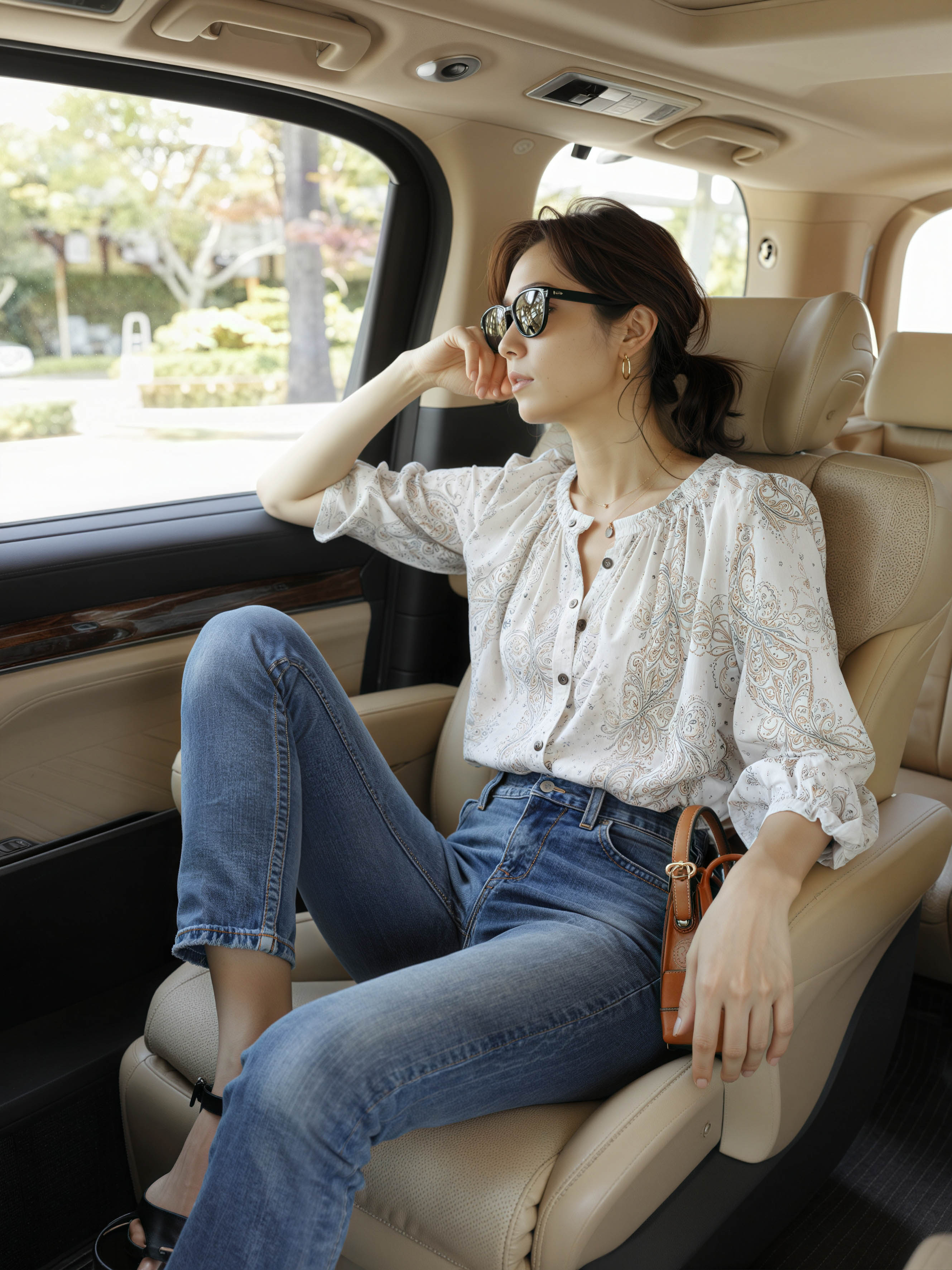高級車の運転席に座り、ペイズリー柄の白いブラウスとブルー ジーンズを着て、黒いサンダルを合わせ、茶色の革のハンドバッグを持った若い女性を横から写実的に撮影した写真。画像の中央では、色白の肌と長い茶色の髪の女性が車の後部座席に快適に座っています。彼女は黒いサングラスをかけ、あごに手を当て、リラックスした表情でカメラから目をそらしています。車にはベージュの革シートがあり、車内は清潔で手入れが行き届いており、窓から自然光が差し込みます。背景には、車の窓の外の木々や緑のぼやけた景色が表示されます。
