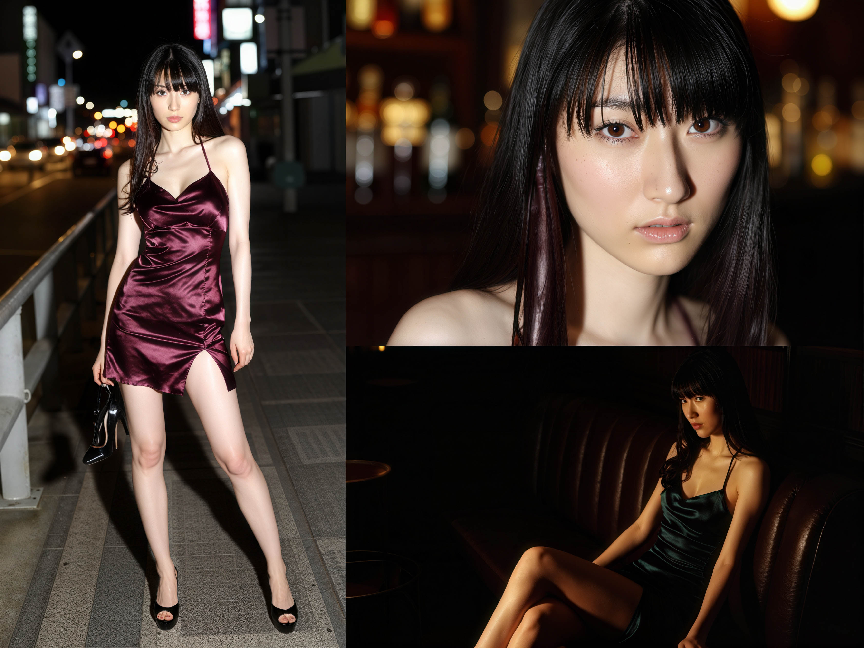 夜の薄暗い都会の環境で自信を持ってポーズをとる若い女性を正面カメラのアングルから写実的に撮影したもの。この画像は 4 枚の写真で構成されており、それぞれが被写体の異なる側面を示しています。 左側の最初の写真は、マルーンのサテンのスリップドレスと黒いハイヒールを着て、夜の街路に自信を持って立っている若いアジア人女性を示しています。前髪のある長い黒髪と茶色の瞳が特徴で、中性的な表情でカメラを見つめています。彼女の体はスリムで引き締まっており、片手を腰に当て、もう一方の手を黒いハンドバッグを持って立っています。背景にはぼやけた街の明かりや建物が表示され、ボケ味が生まれます。 2 番目の写真では、同じ女性が画像の中央のソファに座っています。彼女は深緑色のサテンのドレスを着ており、真剣な表情をしています。彼女の髪はストレートに整えられており、目は茶色です。彼女の肌は白く滑らかで、唇はわずかに開いています。彼女の姿勢は自信に満ちていて、落ち着いています。照明は柔らかく温かみがあり、彼女の特徴を強調し、穏やかな雰囲気を作り出しています。