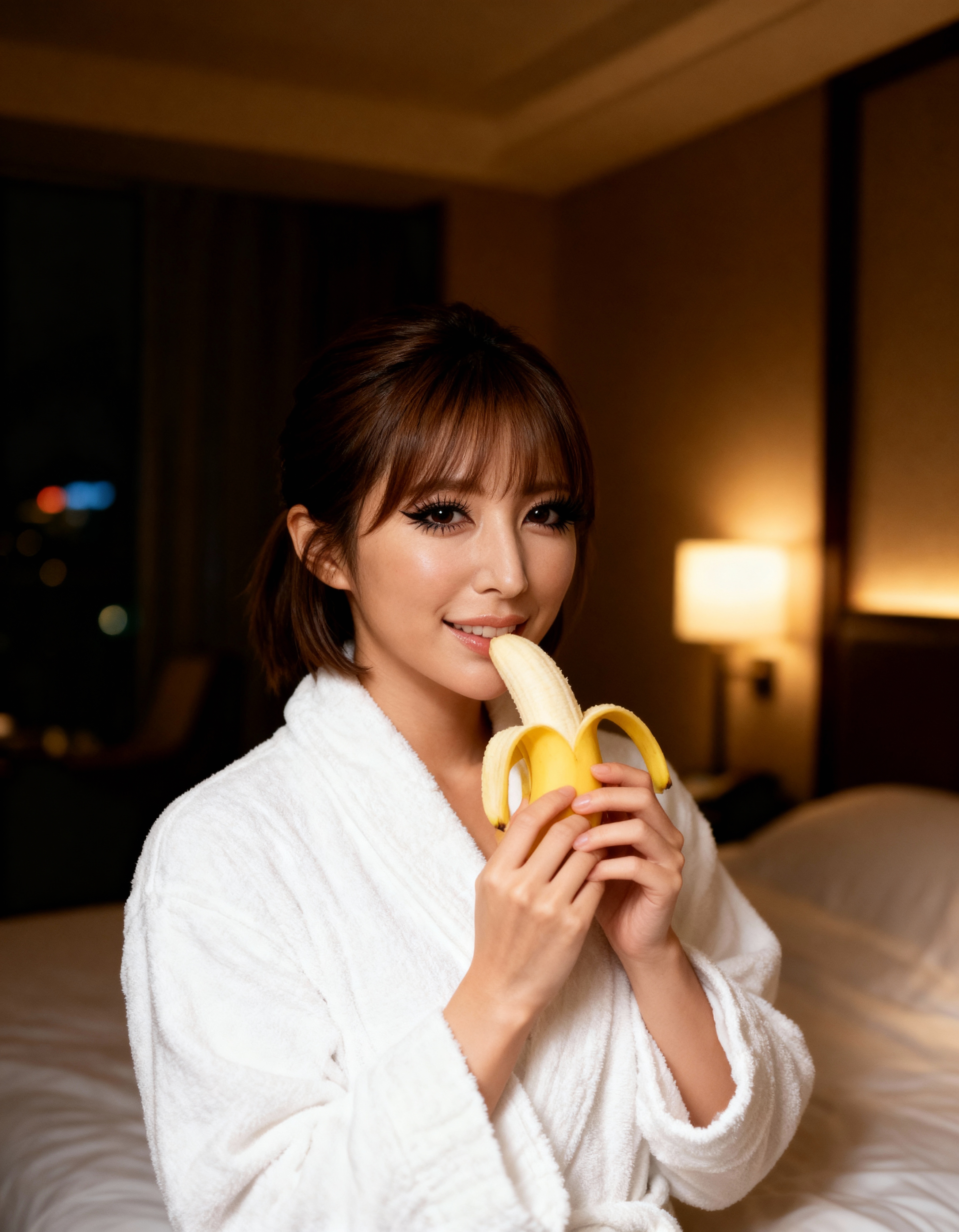 ホテルの部屋でバナナを持った白いバスローブを着た若い女性を正面から写実的に撮影したもの。この画像には、背景に柔らかな照明とぼやけた街の明かりが写っており、居心地の良い雰囲気を作り出しています。画像の中央には、前髪のあるショートヘアにまとめた茶色の髪をした10代後半と思われる若いアジア人女性が、笑顔でカメラをまっすぐに見つめている。彼女は皮をむいたバナナを顔の前に持ち、右手をバスローブの端に置いています。女性はほっそりとした体をしており、白いローブを着ており、そのローブが開いて肩が露出している。彼女の目は茶色で、長いまつげがあり、口はわずかに開いており、ほのかに笑みを浮かべています。部屋は薄暗く、ベッドとランプが暖かな光を放ち、背景がぼかされて幻想的な雰囲気を醸し出しています。
