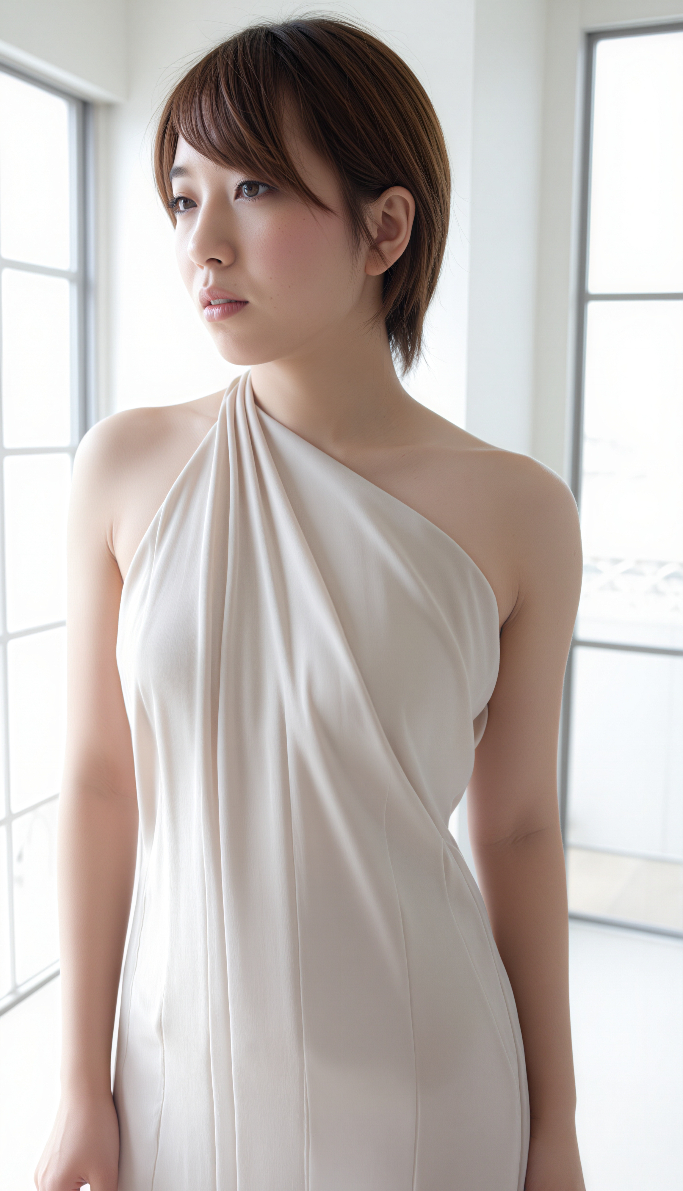 大きな窓の前に立つ白いワンショルダードレスを着た若い女性を横顔カメラのアングルから写実的に撮影したもの。この画像には、柔らかな照明とミニマルな装飾も示されています。画像の中央では、20歳のアジア人女性が中立的な表情で視聴者を見つめているように見えます。彼女は、前髪が顔を縁取ったボブカットの短い茶色の髪をしています。彼女の目は深い茶色で、カメラをまっすぐに見つめています。彼女は、体の周りにエレガントにドレープされた白いノースリーブのドレスを着ており、彼女のスリムな体型と繊細な特徴を強調しています。ドレスには細いストラップとフィットしたボディスがあり、彼女の曲線を強調しています。女性は大きな窓のある明るい部屋に立っており、自然光が空間に入り込み、明るく風通しの良い雰囲気が生まれています。