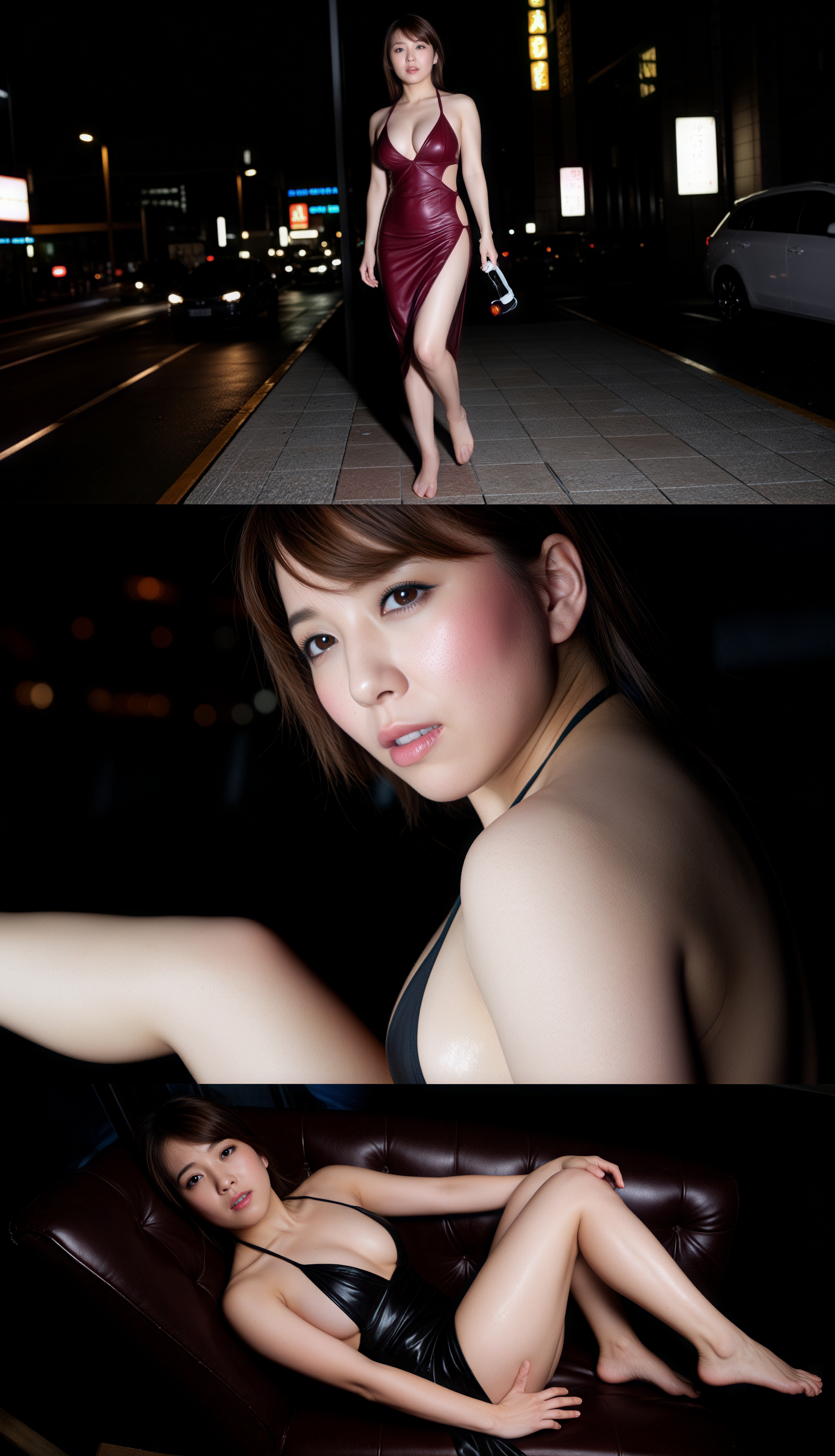 夜の街路で、露出度の高いタイトな赤いドレスを着て自信を持ってポーズをとる若い女性をフィーチャーした、トップダウン視点からの写実的な撮影。画像の中央には、10代後半から20代前半と思われる女性が自信満々に両手を前に組んで立ち、中立的な表情でカメラをまっすぐに見つめている。彼女は短くてストレートな茶色の髪をしていて、最小限の化粧をしていて、頬はわずかに赤みを帯びており、唇には微妙な笑いが浮かんでいます。彼女の目は印象的な青色で、顔にはわずかに笑みを浮かべています。彼女の体はスリムで引き締まっており、大きな胸と裸の肩を持っています。彼女は彼女の曲線を強調する露出度の高い黒い革のドレスを着ています。背景にはネオンが輝く街並みや路肩に駐車された車が描かれており、暗くムーディーな雰囲気とドラマチックなコントラストを生み出しています。照明は柔らかく温かみがあり、彼女の特徴を強調し、画像に奥行きと立体感を生み出しています。全体的な効果は洗練さと優雅さの1つであり、見る人の注意を引く魅惑的で魅惑的なイメージとなっています。