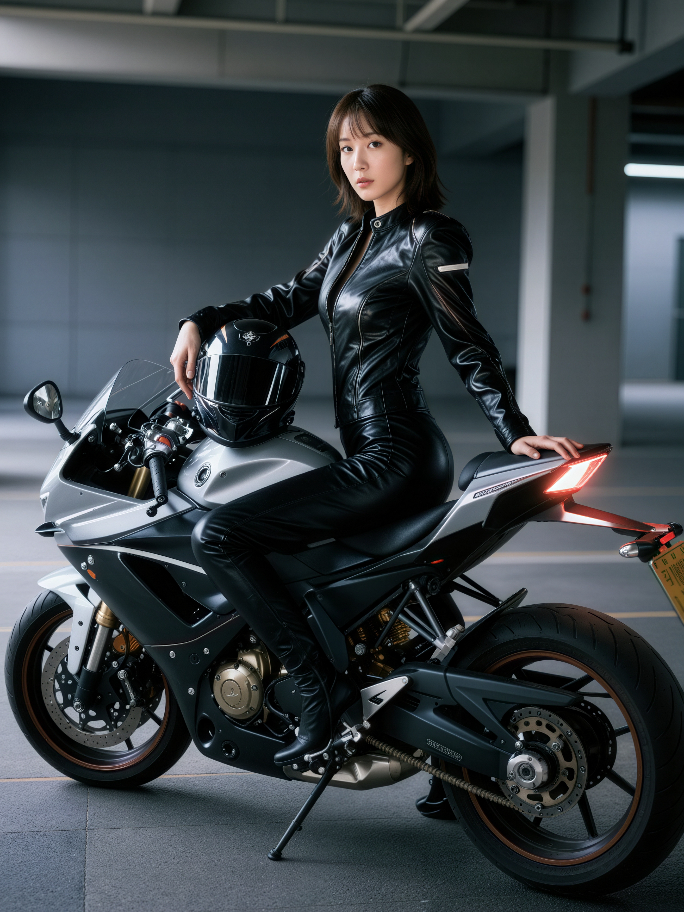 薄暗い駐車場で、洗練された黒の革服を着た若い女性がバイクに座っている様子を横から撮影した写実的な写真。この画像には、洗練されたデザインと洗練されたリアライトを備えた未来的なオートバイも示されています。画像の中央には、黒髪のショートヘアで真剣な表情の20歳のアジア人女性がバイクに座っている。彼女は長袖のジャケット、ズボン、ブーツからなる黒い革のスーツを着ており、左手には黒いヘルメットを持っています。彼女の髪はショートボブカットで、背中に流れています。彼女の目は視聴者をまっすぐに見つめており、20代半ばのように見えます。彼女の体はスリムで、顔には中性的な表情があります。バイクはシルバーに黒のアクセントがあり、洗練された空力デザインを採用しています。背景は灰色の壁と柱のあるコンクリートの駐車場で、照明は薄暗く、ドラマチックな効果を生み出しています。