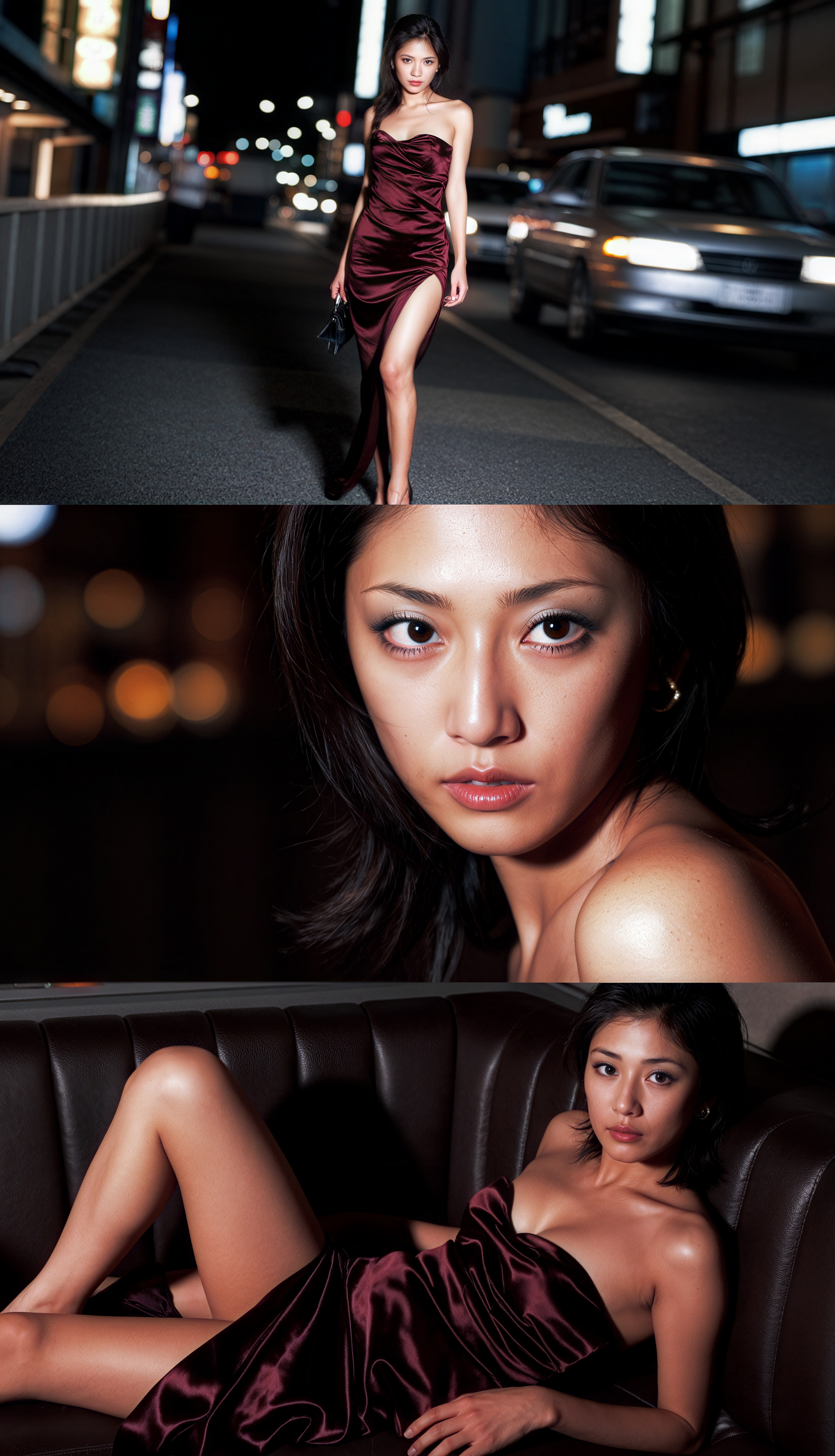 夜に豪華なワインレッドのドレスを着てポーズをとる女性を、コラージュの角度から写実的に撮影したもの。この画像には、ぼやけた光を背景に夜の街路を走行する車も写っています。左上隅では、曲線を強調するストラップレスのワインレッドのサテンのドレスを着た女性が自信を持って通りに立っています。彼女は長くて黒髪で、真剣な表情でカメラをまっすぐに見つめています。彼女の目は印象的な茶色で、長いまつげが強調されています。彼女の体はスリムで引き締まっており、肩はむき出しで、胸はわずかにカーブしています。彼女はイヤリングをしており、ハンドバッグを肩にかけています。背景はぼかしてありますが、建物や照明が都会的な雰囲気を醸し出しており、ドラマチックな効果を生み出しています。イメージ全体の雰囲気は洗練されており、女性の美しさと優雅さに焦点を当てています。