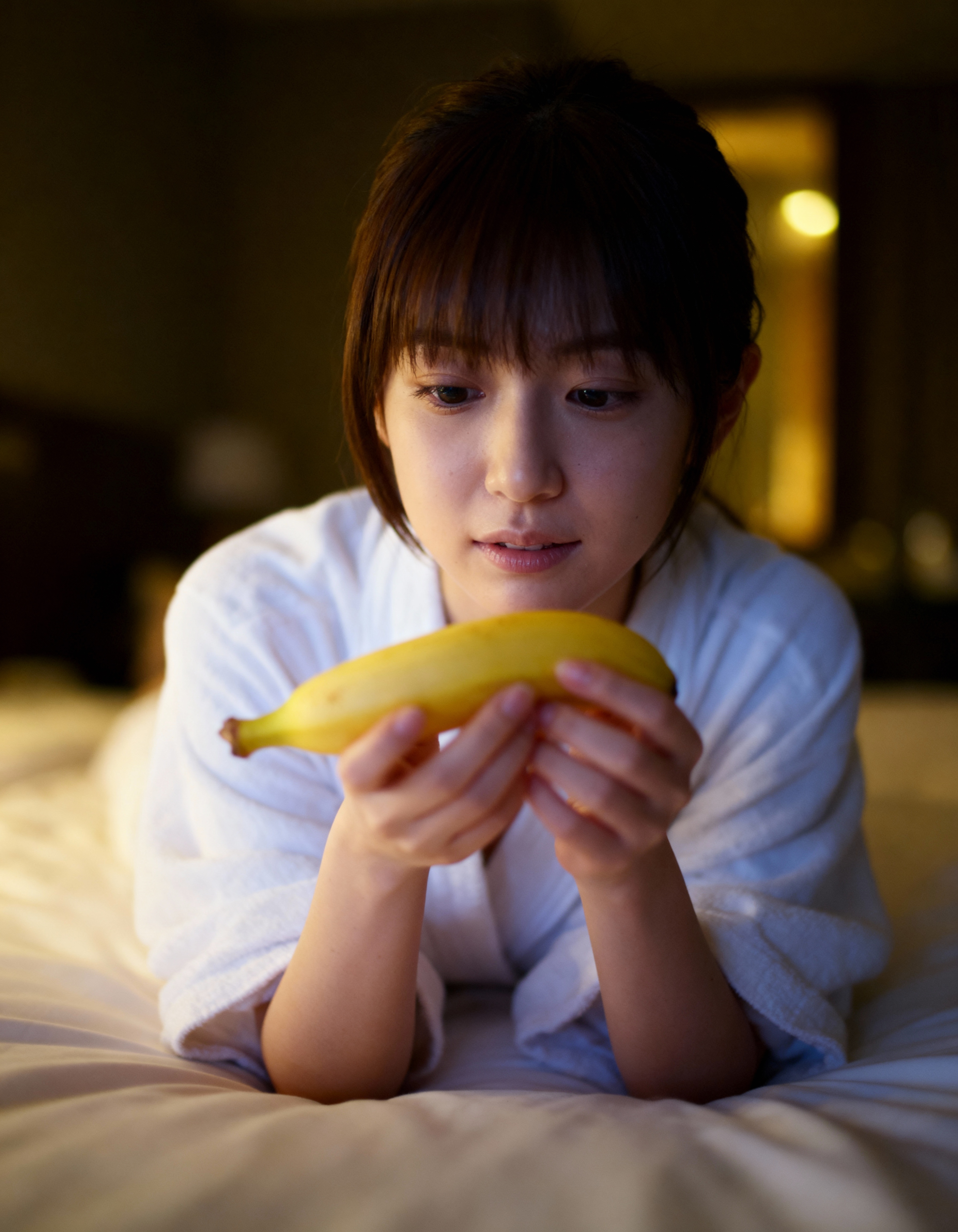 薄暗い寝室のベッドに横たわり、顔の前にバナナを持った若い女性をクローズアップ カメラ アングルで写実的に撮影したもの。画像の中央には、濃い茶色の短い髪と前髪を持ち、白いローブを着た若いアジア人女性が写っています。彼女は10代後半か20代前半に見え、中性的な表情とわずかな笑みを浮かべています。彼女の目は視聴者をまっすぐに見つめており、まるで何かを言おうとしているかのように口をわずかに開いています。彼女は熟した黄色のバナナを両手に持ち、指をしっかりと巻き付けています。照明は柔らかく温かみのある居心地の良い雰囲気を作り出し、背景をぼかし、柔らかく暖かい色で部屋の柔らかさを引き出します。全体的な雰囲気は親密で瞑想的で、女性の表情とバナナの質感に焦点が当てられています。