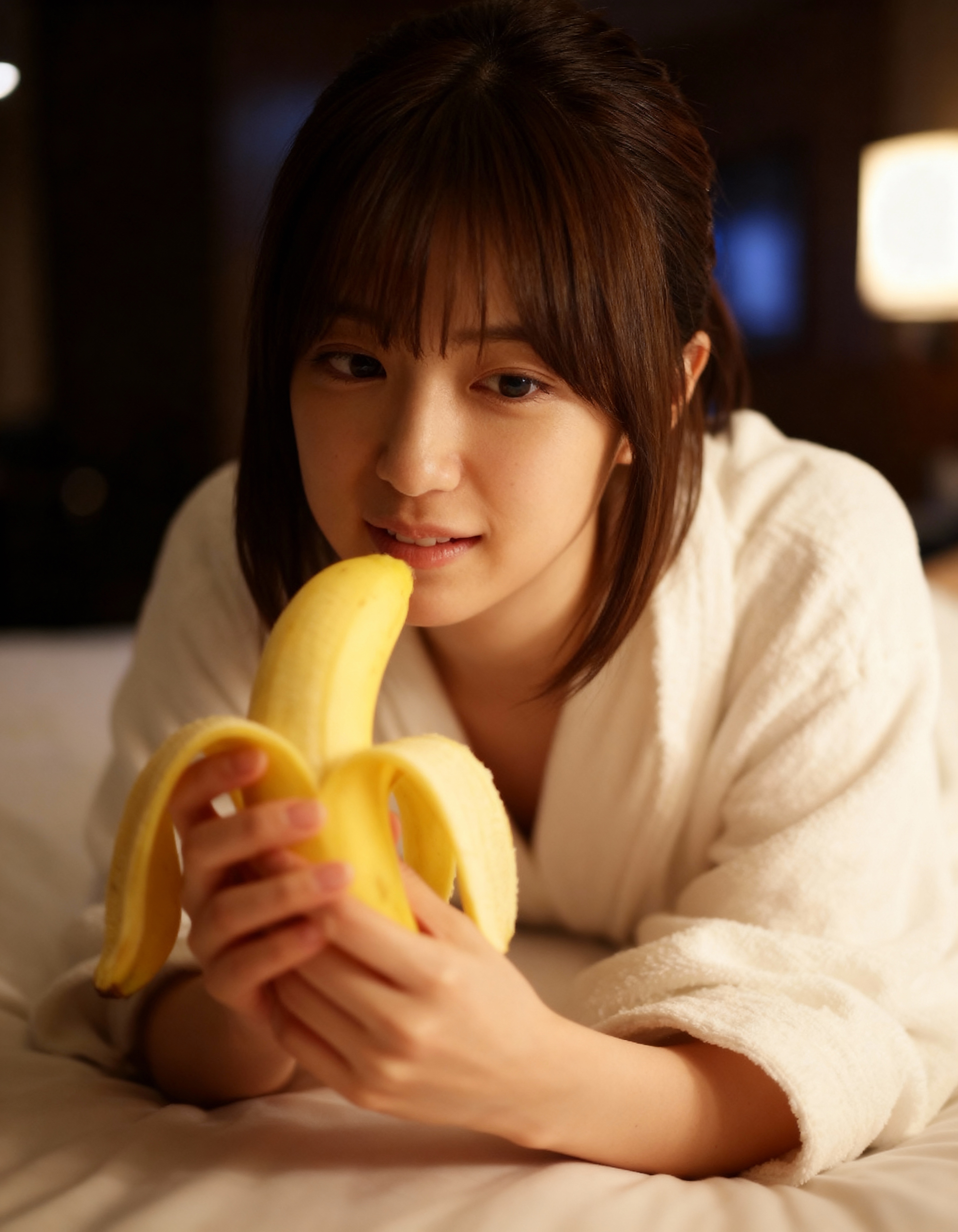白いバスローブを着た若い女性がベッドに横たわり、バナナを持ち、遊び心のある表情でカメラを見つめている様子をクローズアップカメラアングルから写実的に撮影したもの。この画像には、ランプのあるリビング ルームの柔らかな照明とぼかした背景も示されています。画像の中央には、白いローブを着た20歳のアジア人女性がうつ伏せになって顔の前に皮をむいたバナナを持っているように見える。彼女は短くストレートなダークブラウンの髪をしており、中性的な表情で視聴者をまっすぐに見つめています。彼女の目は大きく茶色で、口元にはかすかに笑みを浮かべています。女性はバナナを両手に持ち、口を少し開け、唇を少し開いています。照明は柔らかく温かみがあり、居心地の良い雰囲気を作り出しています。背景がぼやけていますが、背景にベッドとランプがある屋内の設定のようです。