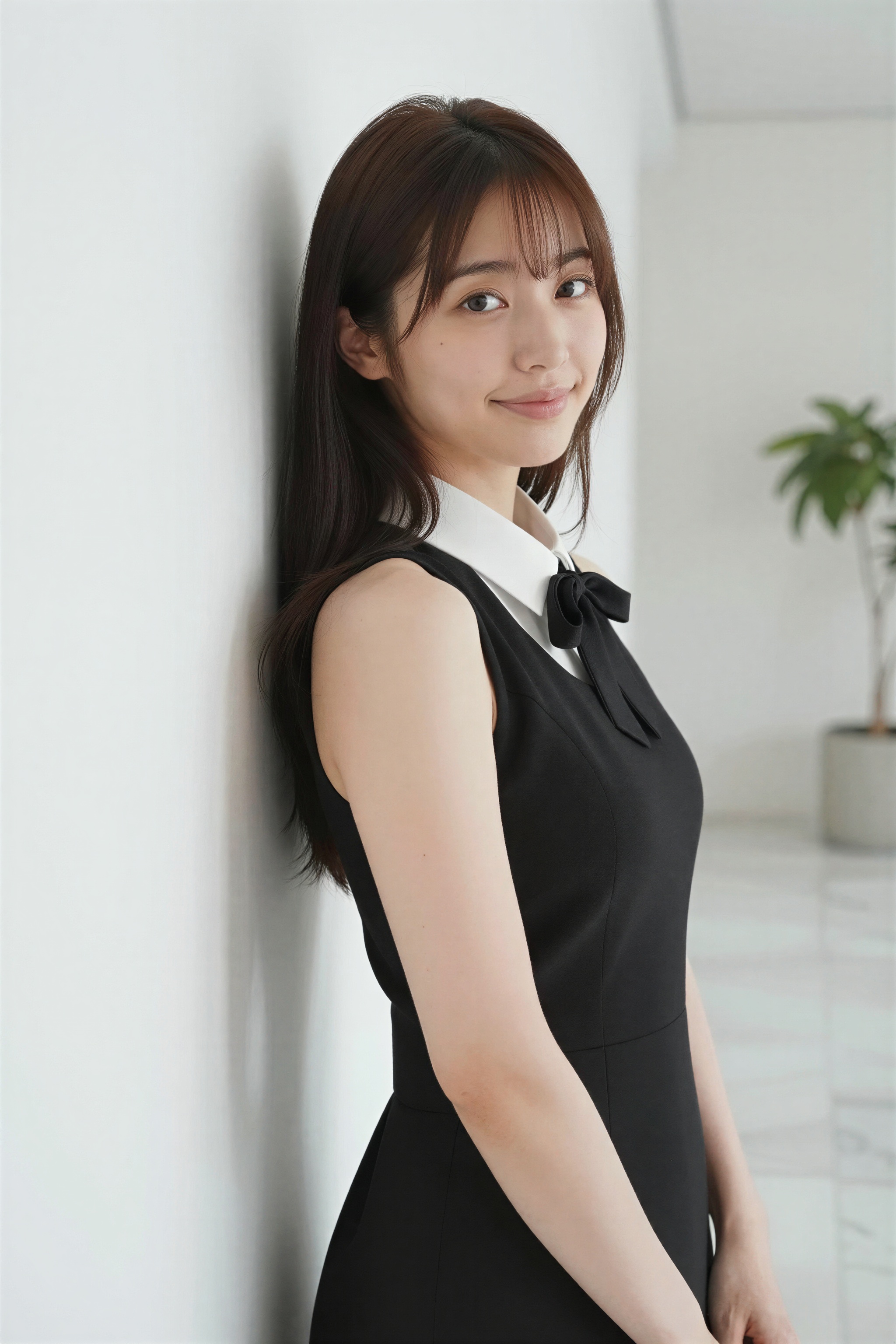 屋内で白い壁に向かって立つ、フォーマルなビジネス服を着た若い女性をポートレートアングルから撮影した写実的な写真。画像には背景に鉢植えの植物も写っています。画像の中央では、20歳のアジア人女性が上半身を見せて立っているように見え、黒いノースリーブのドレスを着て、下に白い襟付きのシャツを着て黒い蝶ネクタイをしている。彼女は長い茶色の髪、茶色の目、そして顔にわずかな笑みを浮かべており、茶色の目でカメラを直接見つめています。髪はストレートに整えられており、頬は少し赤くなっています。彼女の体はスリムで引き締まっており、左肩がわずかにカーブしています。彼女は真っ白な壁の前に立ち、手を腰に置き、自信に満ちたリラックスした姿勢をとっています。。高画質でフリーのNightStock素材です。商用利用可能・クレジット表記不要。