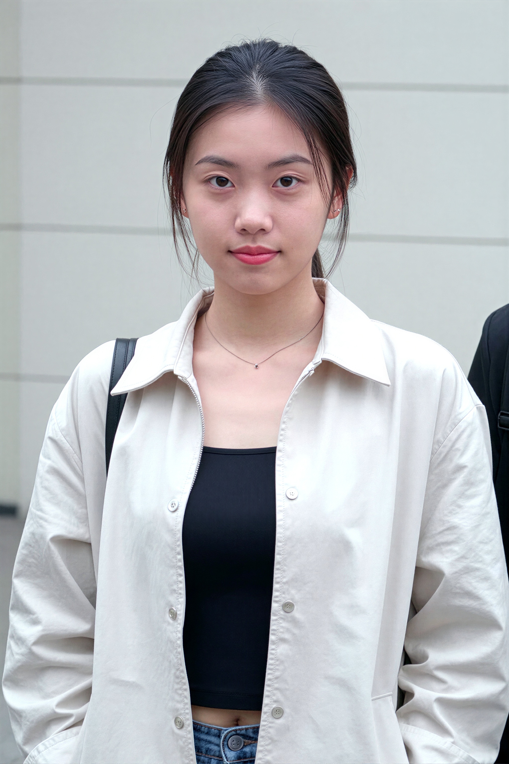 A 彼女は濃い色のトップスの上に明るい色のジャケットを着ており、シンプルなネックレスをしています。彼女の手はフレームの外に出ており、レンズを覗きながら静止していることを示唆しています。背景はニュートラルでわずかにぼやけて見えます。。高画質でフリーのNightStock素材です。商用利用可能・クレジット表記不要。