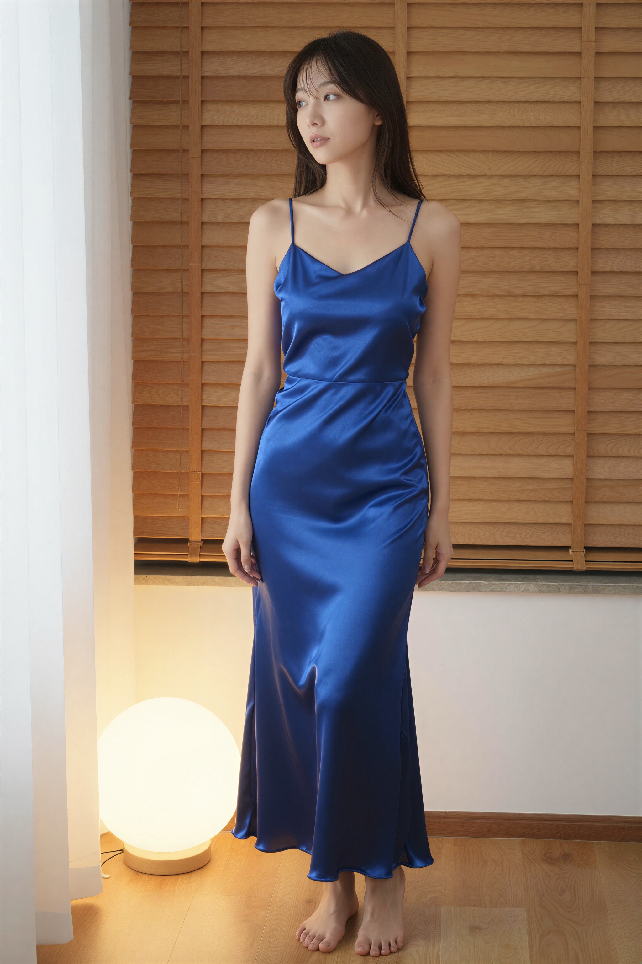 A wearing a blue satin dress that flows down to her ankles.彼女の裸足は、彼女の下の木の床の端に見えます。彼女は長い黒髪を持ち、思慮深い表情で宇宙を見つめています。部屋には、白いカーテンの近くにある照らされた球体からの温かみのある照明と、彼女の後ろの壁を覆う横型の木製ブラインドが特徴です。。高画質でフリーのNightStock素材です。商用利用可能・クレジット表記不要。