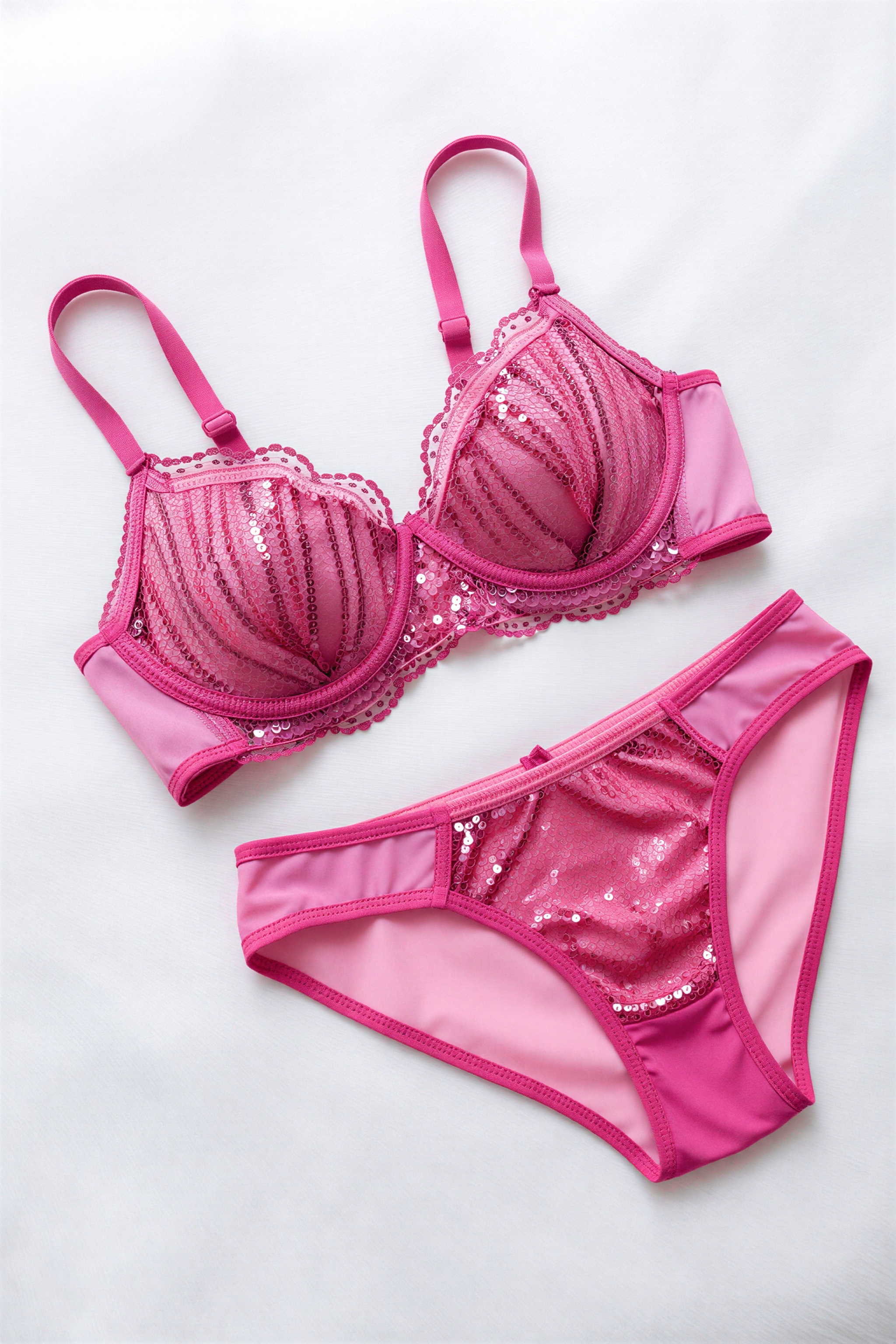 ふわふわの白い毛皮の表面にピンクのランジェリーセットを平らに置いた写真。セットはブラジャーとショーツで構成されており、どちらも光沢のあるスパンコール付きの生地で作られており、繊細なレースのディテールが施されています。ブラジャーにはスクープネックラインと細いストラップが付いており、パンティーには伸縮性のあるウエストバンドとフリル付きのヘムラインが付いています。ブラジャーは画像の左側にあり、パンティー。。高画質でフリーのNightStock素材です。商用利用可能・クレジット表記不要。