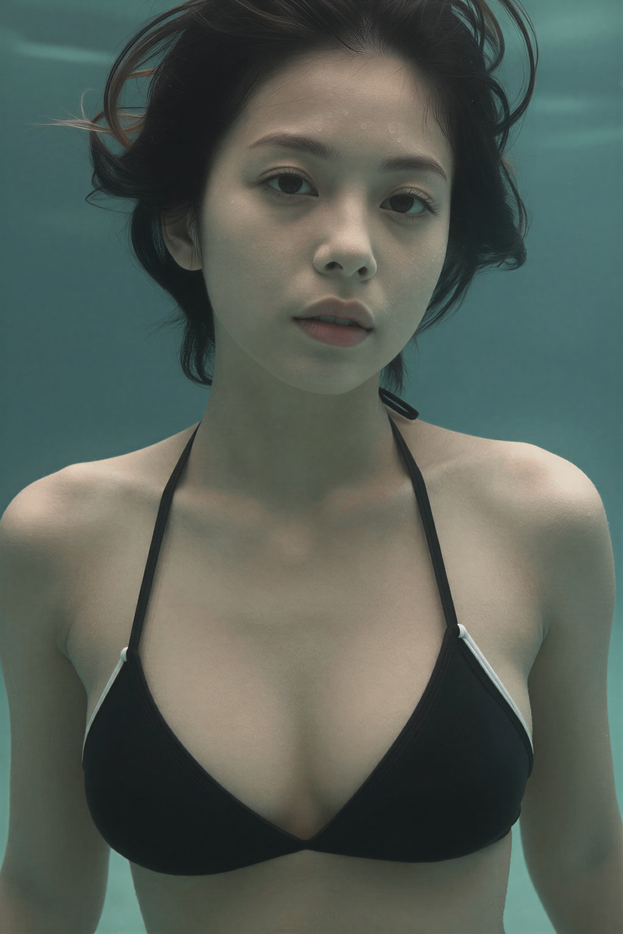 見上げる低い角度から撮影された若者の写実的な水中ポートレート。彼女は暗く濡れた髪を乱雑なお団子状にまとめており、緩んだ髪が顔の縁取りで額に張り付いている。彼女の目は大きくて表情豊かで、柔らかく、少し魅惑的な表情で見る人をまっすぐに見つめています。彼女の唇は自然に離れています。彼女は各カップの縁に沿って白いトリムが付いた黒いビキニトップを着ています。。高画質でフリーのNightStock素材です。商用利用可能・クレジット表記不要。