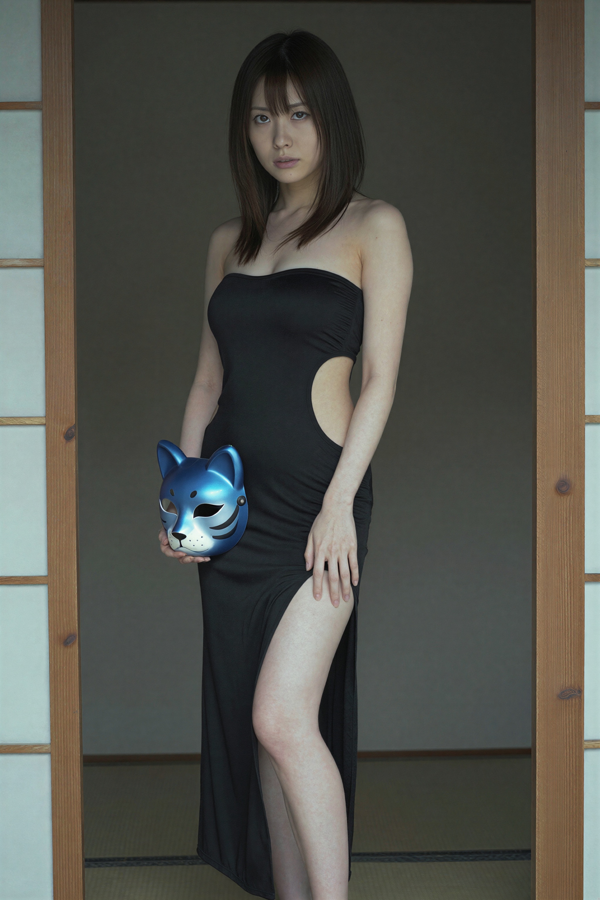 美しい日本人女性、若い日本人女性が、右側の木の引き戸と左側の暗い戸口に囲まれた、薄暗い伝統的な日本のインテリアに立っています。彼女は前髪のあるストレートの黒髪で、カメラに向かって真剣なまっすぐな視線を持っています。彼女のポーズは自信に満ちたわずかに角度があり、片方の手は腰の近くに置き、もう片方の手はメタリックブルーの猫のマスクを持っています。。高画質でフリーのNightStock素材です。商用利用可能・クレジット表記不要。