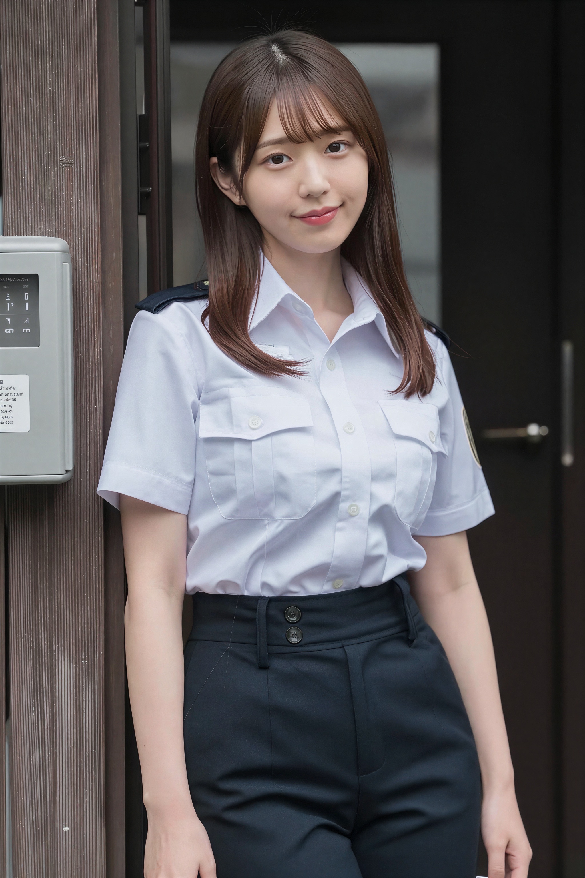 美しい日本人女性。若い日本人女性が、都会の公共ボックスか小さなブースのような暗い木の枠にもたれて何気なく立っており、長い黒髪を肩に垂らして、柔らかく優しい微笑みを浮かべて見る人をまっすぐに見つめている。彼女は、パリッとした白い半袖ボタンアップシャツをハイウエストの黒いズボンにきちんと入れた、精巧な警察スタイルの制服を着ています。プロのポートレート写真撮影。。高画質でフリーのNightStock素材です。商用利用可能・クレジット表記不要。