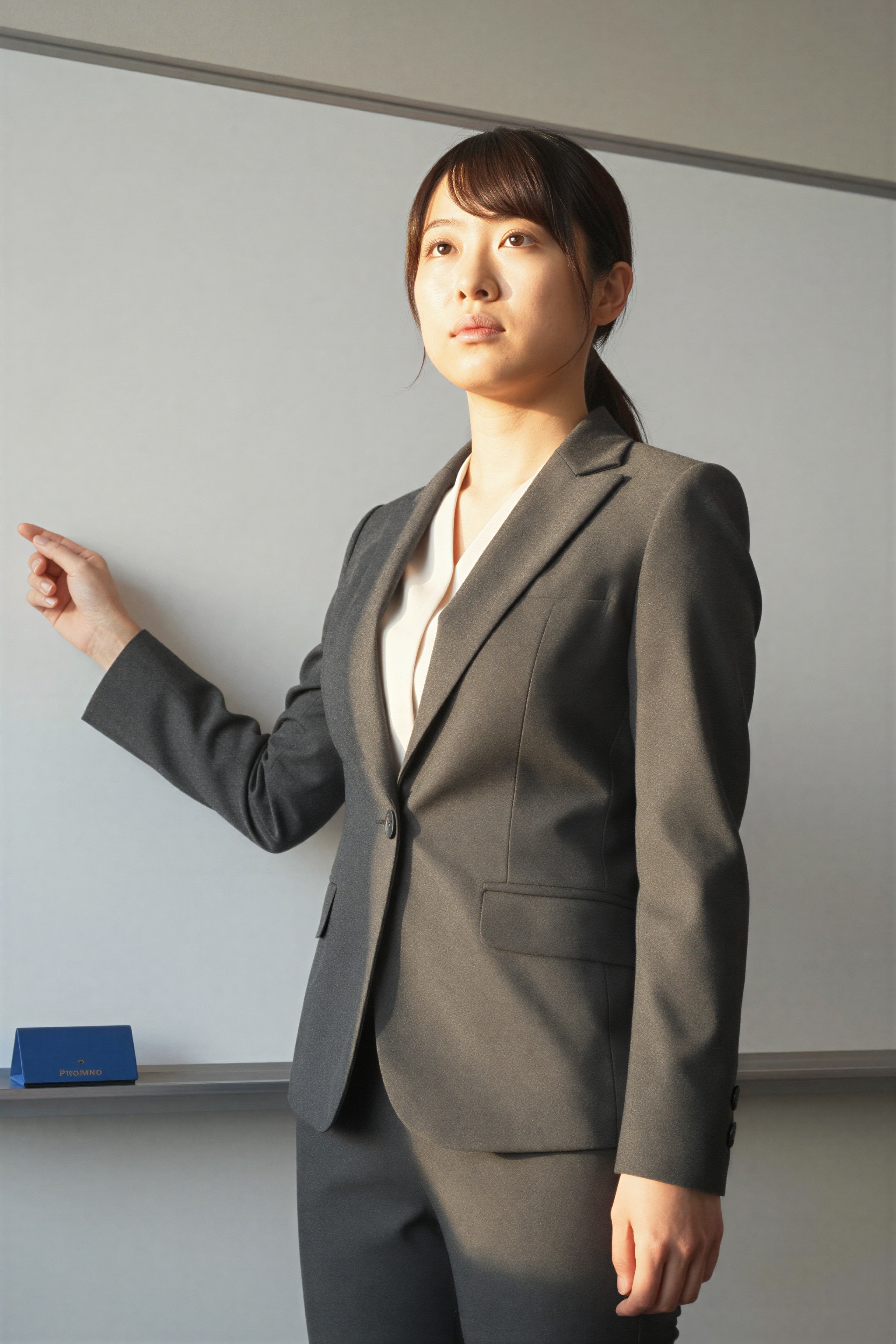 現代の会議室でテーラードの木炭スーツを着て、ホワイトボードでプレゼンテーションを行う日本の実業家。高画質でフリーのNightStock素材です。商用利用可能・クレジット表記不要。