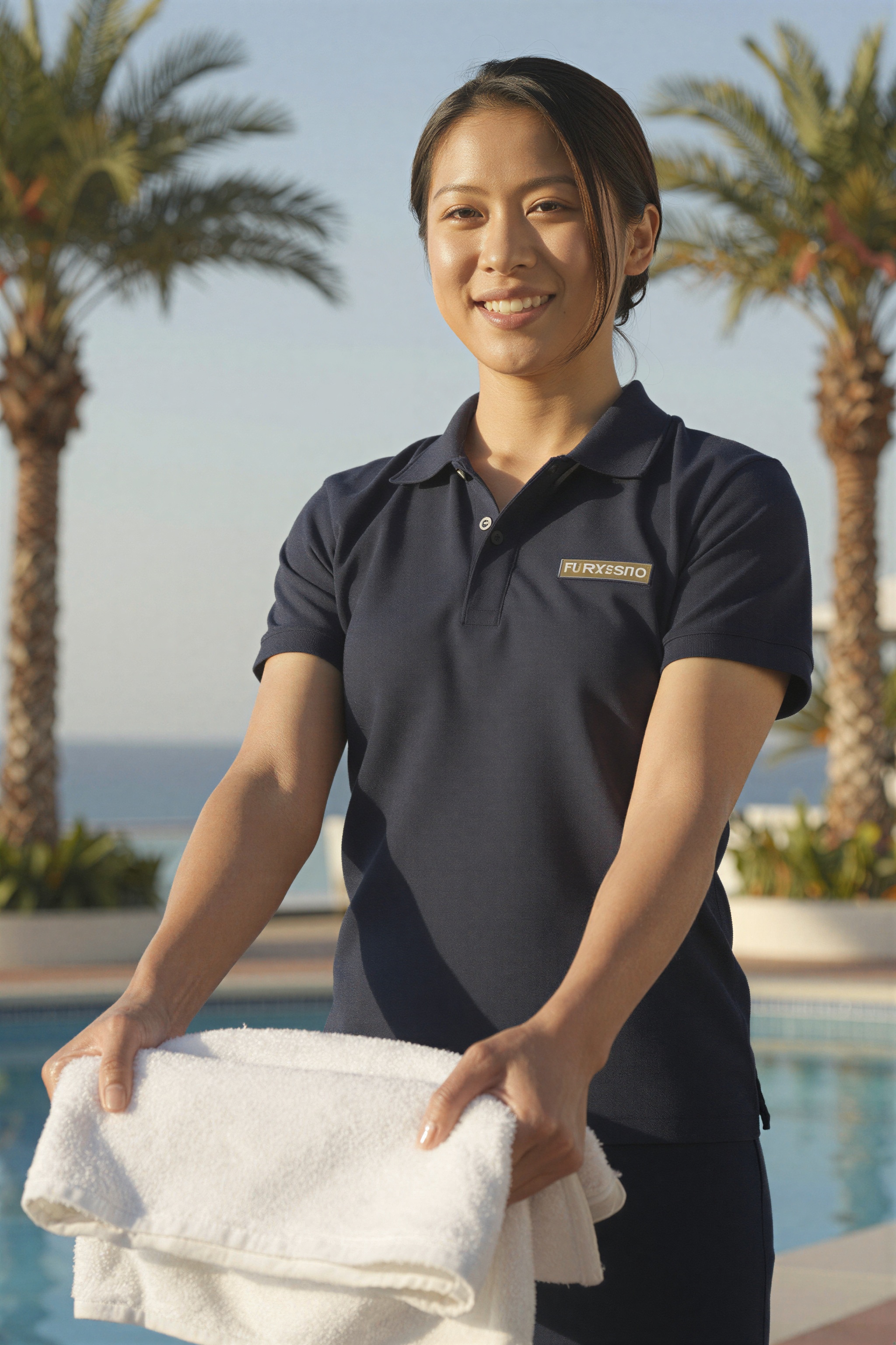 タオルを手渡す日本人女性ホテルのプールアテンダント、ポロシャツを着て、トロピカルリゾートのプール、ヤシの木、青空。高画質でフリーのNightStock素材です。商用利用可能・クレジット表記不要。