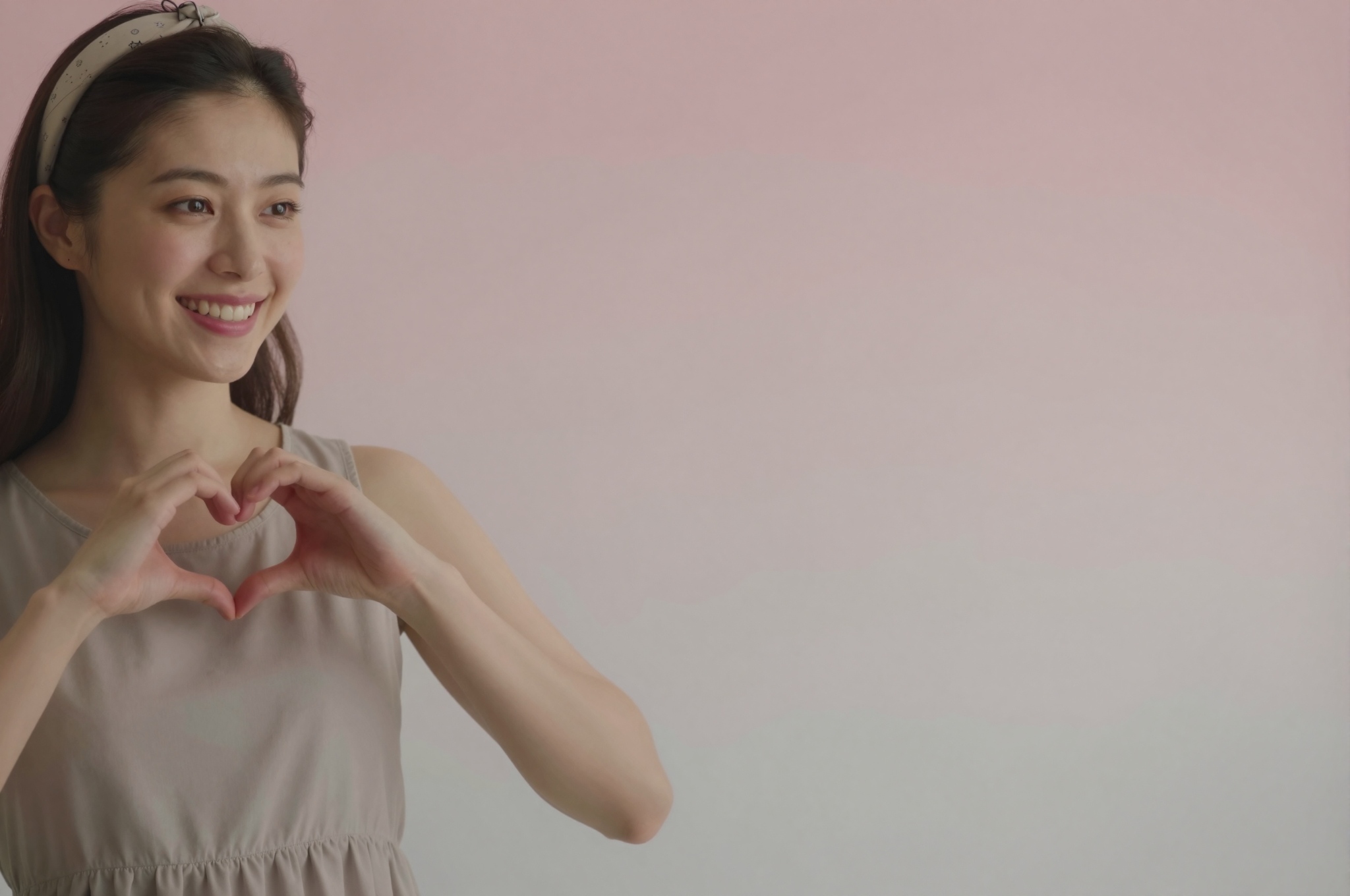 シンプルでキュートなドレスを着て、カチューシャのアクセサリーを付けた美しい日本人女性が左端で手でハートの形を作り、首から下を見せています。背景は、小さな星の装飾が施されたクリームホワイトに変わる柔らかいコーラルピンクのグラデーションで、右側にテキスト用の 60% の空きスペースが作成されます。穏やかな光で甘く魅力的な雰囲気です。テキスト、文字、数字、書き込み、透かしは一切ありません。。高画質でフリーのNightStock素材です。商用利用可能・クレジット表記不要。