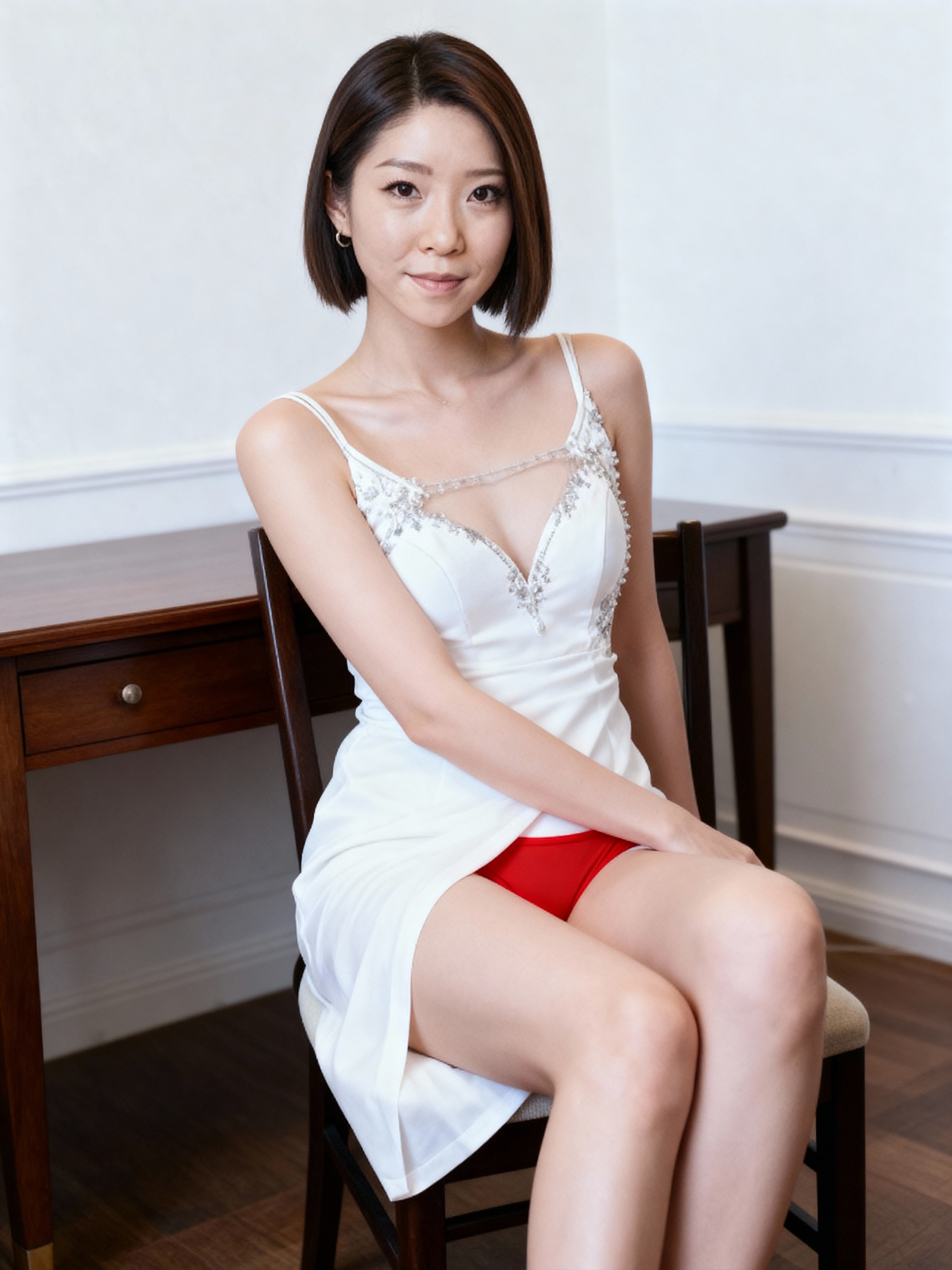 レースのディテールが施された白いドレスを着て、赤いパンティーを履いて木の椅子に座っている若い女性を正面から写実的に撮影したもの。画像の中央では、ダークブラウンの短くストレートな髪をした20歳のアジア人女性が、カメラに向かって微笑んでいるように見えます。彼女は足を組んで座っており、手を膝の上に置いています。女性は細いストラップとネックラインに沿ったレースのトリムが付いた白いノースリーブのドレスを着ており、裸の肩と中くらいの大きさの胸が露出しています。彼女の赤いパンティは腰の近くまで押し込まれており、彼女のスレンダーな体型を強調しています。背景はシンプルな無地の白い壁で、隅に木製の机があり、部屋のミニマルな美しさをさらに高めています。照明は柔らかく自然で、女性の特徴とドレスの質感を強調しています。