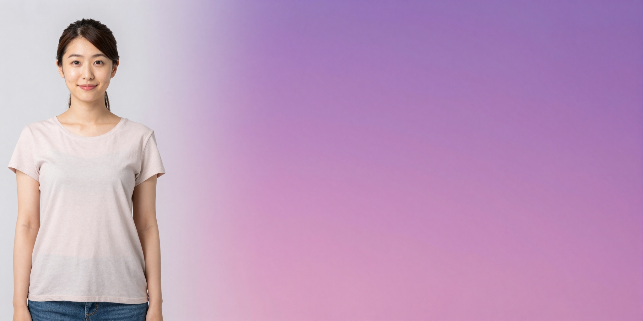 かわいいカジュアルな服を着た魅力的な日本人女性が左端にいて、体の一部だけが見えています。右側の広大な空の領域は、濃い紫から濃いピンクへのシンプルでエレガントなグラデーションで、テキスト用の活気に満ちた魅力的なスペースを提供します。テキスト、文字、数字、書き込み、透かしは一切ありません。高画質でフリーのNightStock素材です。商用利用可能・クレジット表記不要。