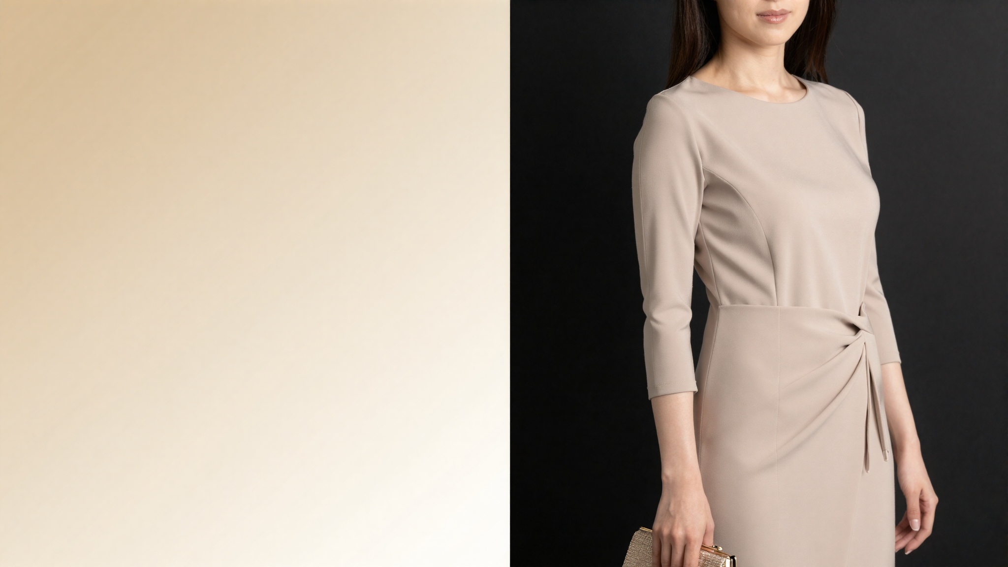 美しい日本人女性が右端に、半ば背中を向け、華奢なクラッチバッグを持って立っている。彼女の顔は見えず、髪が横顔を完全に覆っています。彼女は、長袖と繊細なクリスタルのディテールが施されたシャンパン色のエレガントなドレスを着ています。背景は滑らかなクリームからゴールドのグラデーションで、微妙な幾何学模様の透かしが入っており、モダンでシックな雰囲気を醸し出しています。。高画質でフリーのNightStock素材です。商用利用可能・クレジット表記不要。