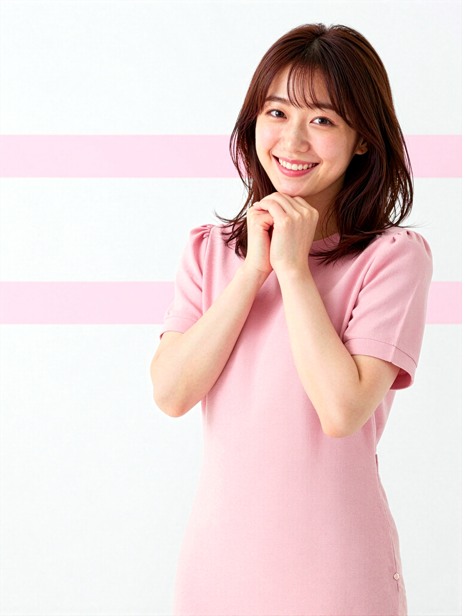 流行の若者向けのファッションアクセサリーを身に着けたスタイリッシュなカジュアルコーディネートを着た美しい日本人女性が、フレームの右側にかわいらしく手を組んで立っています。彼女の表情は明るくて魅力的です。清潔感のある白地にパステルピンクのストライプのアクセントと優しい輝きがモダンで爽やかな雰囲気を醸し出します。テキスト、文字、数字、書き込み、透かしは一切ありません。高画質でフリーのNightStock素材です。商用利用可能・クレジット表記不要。