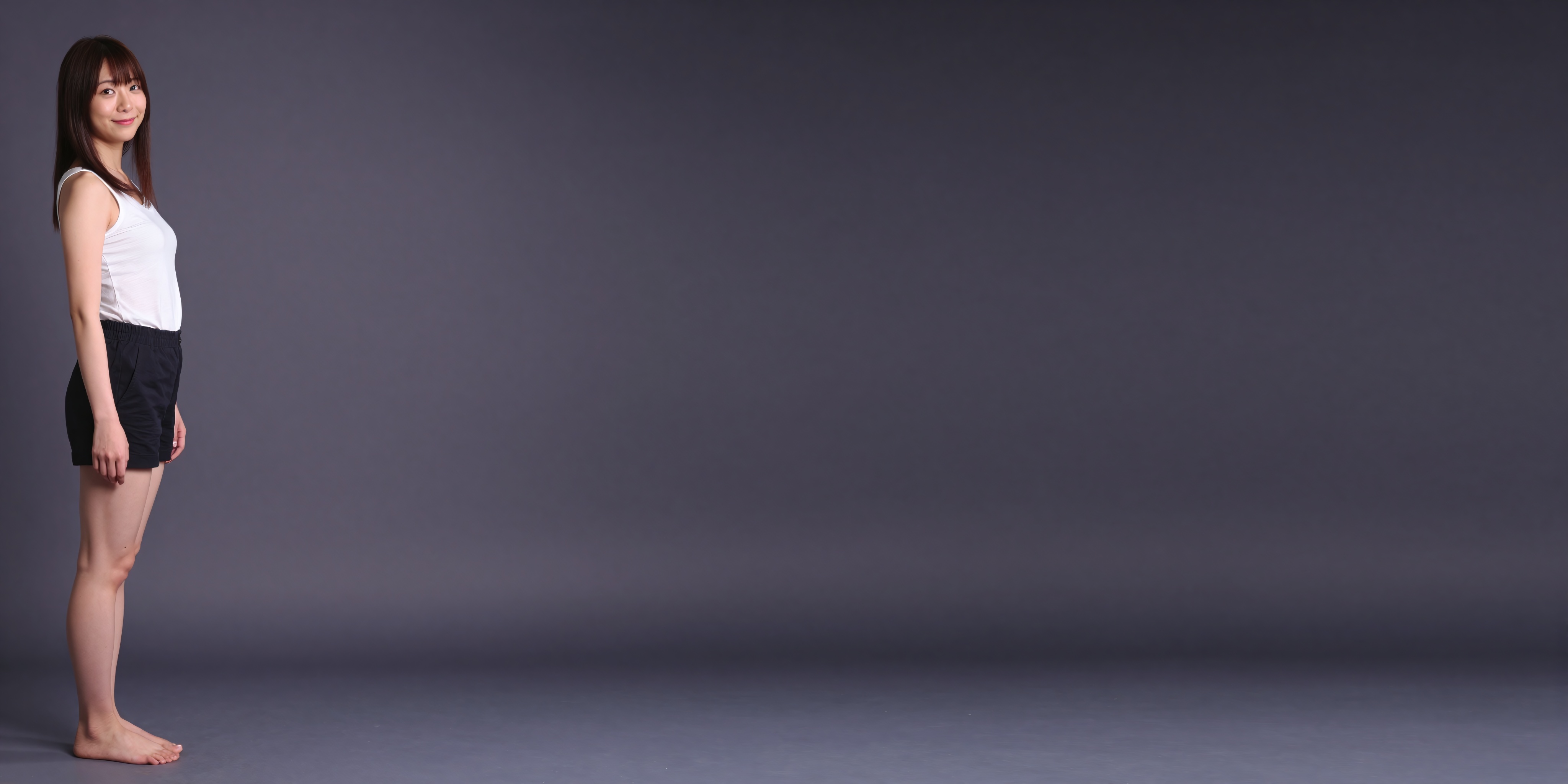 左端には、かわいいカジュアルな服装をした美しい日本人女性が、小さくエレガントな姿で立っています。滑らかな濃い紫から黒のグラデーションの背景が優勢で、テキスト用の広大な空きスペースが残ります。テキスト、文字、数字、書き込み、透かしは一切ありません。高画質でフリーのNightStock素材です。商用利用可能・クレジット表記不要。