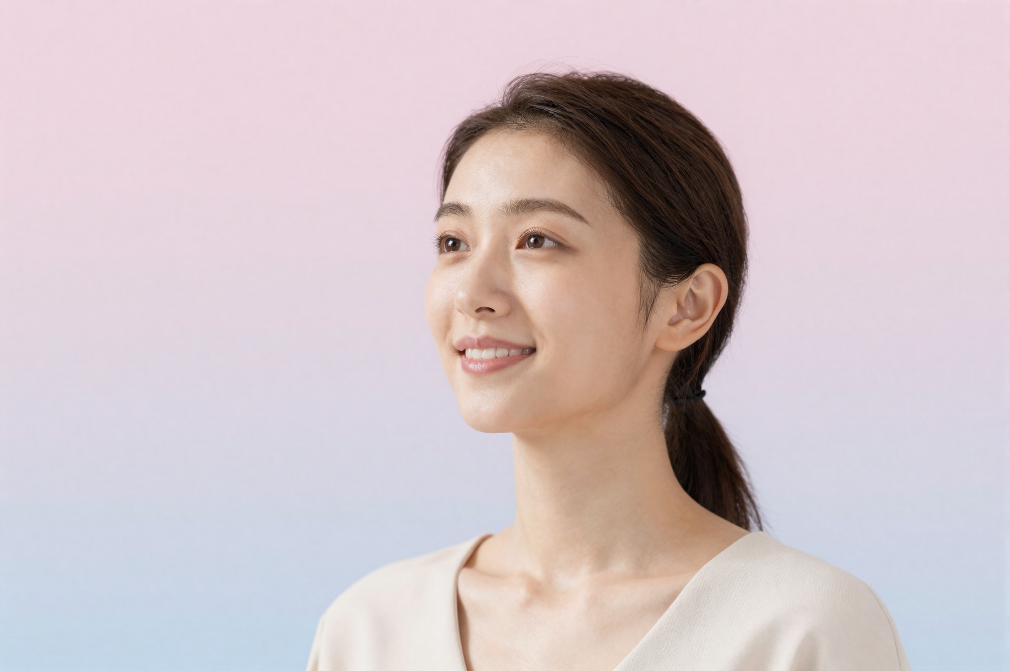 スタイリッシュでモダンな衣装を着た美しい日本人女性を右下から見上げる。輝きの粒子効果を備えた穏やかなピンクからライトブルーのグラデーションがフレームの 70% を占め、見出しに高揚感と活気に満ちた背景を作成します。彼女の視線は楽観主義に満ちています。テキスト、文字、数字、書き込み、透かしは一切ありません。高画質でフリーのNightStock素材です。商用利用可能・クレジット表記不要。