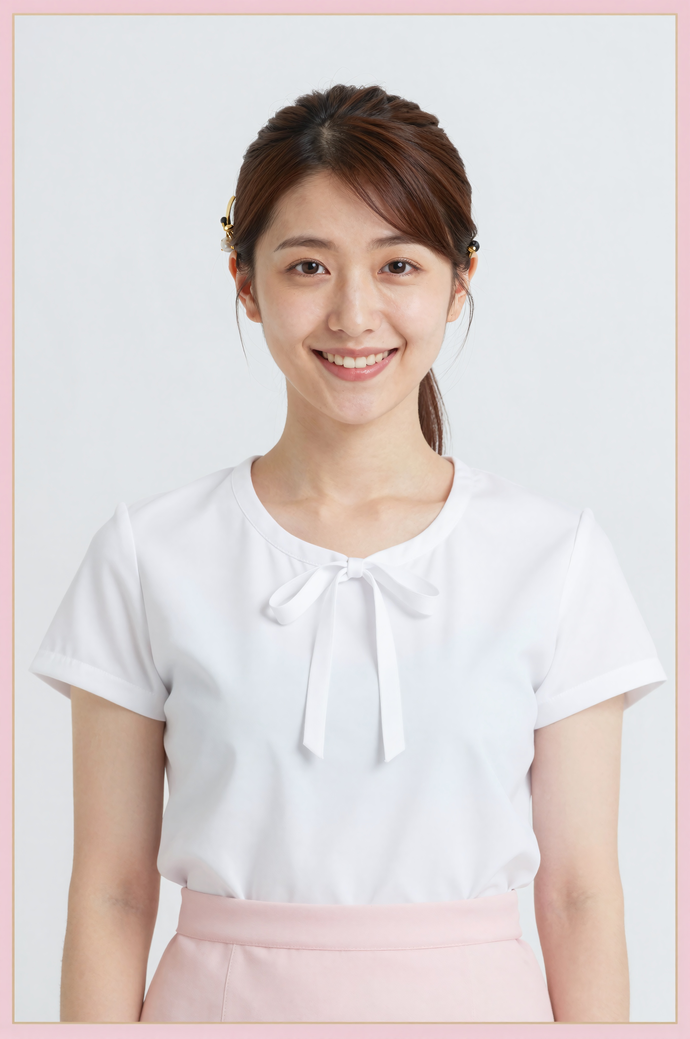 繊細な髪飾りを付け自然な笑顔を見せる日本人女性の肩から上のアップ。可愛らしいリボン結びのブラウスにすっきりとしたスカートを合わせた、元気なバースタッフの雰囲気が伝わってきます。柔らかな白を基調とした背景にピンクのアクセントボーダーと小さな金色の枠飾りがキュートな中に上品さをプラスしています。照明は優しく均一で、彼女の穏やかでフレンドリーな表情を強調しており、文字、文字、数字、書き込み、透かしは一切。。高画質でフリーのNightStock素材です。商用利用可能・クレジット表記不要。
