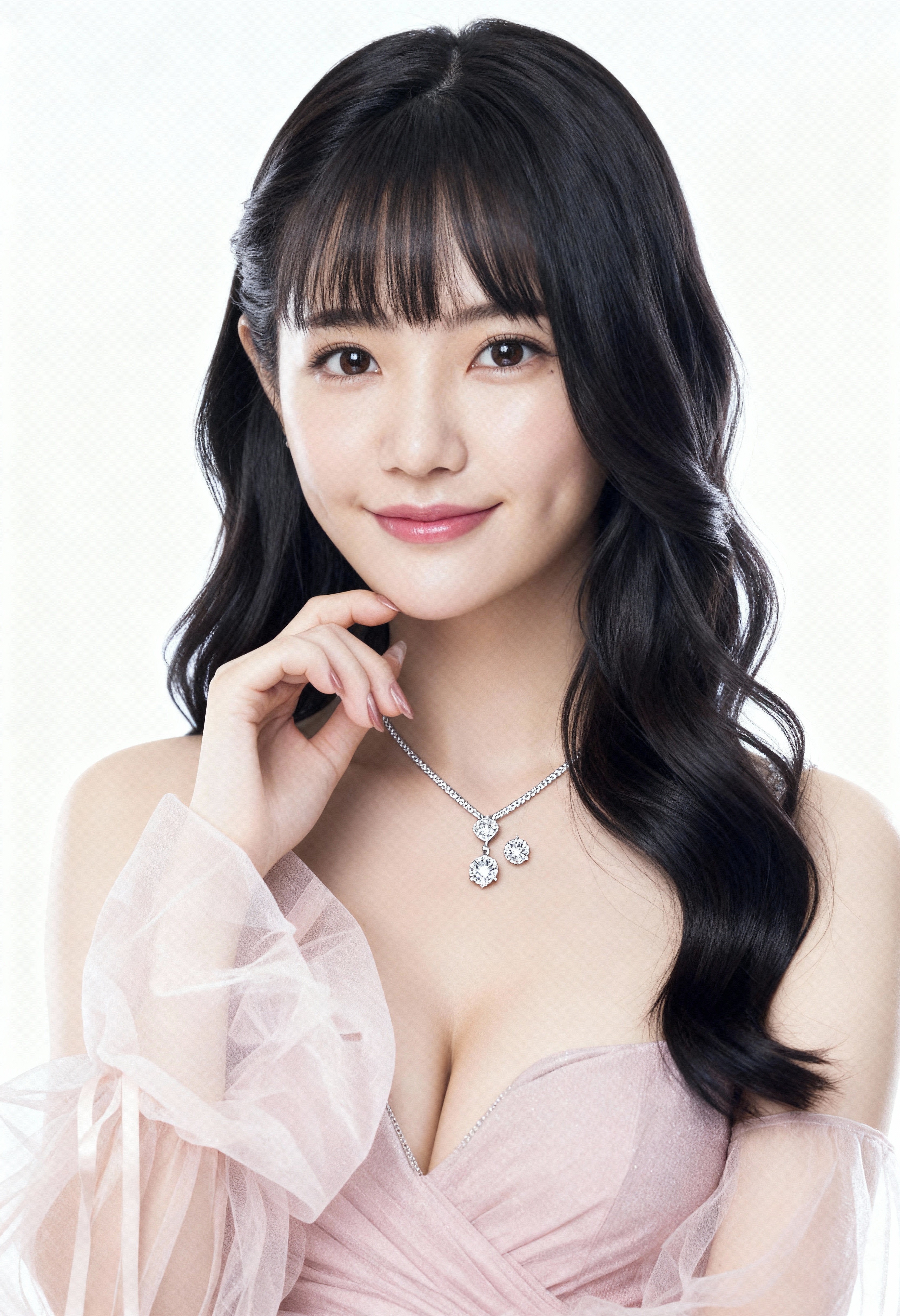 ウェーブのかかった長い黒髪と白い肌を持ち、薄手の袖が付いた繊細な淡いピンクのドレスとハート型のペンダント ネックレスを着た若い女性の写実的なポートレート。彼女は画像の中央でポーズをとり、あごに手を当て、優しい笑顔でカメラをまっすぐに見つめています。女性は10代後半か20代前半のように見え、顔にはわずかな笑みを浮かべ、濃い茶色の目をしています。彼女の髪はゆるいウェーブにスタイリングされ、前髪が顔を縁取り、頬のほのかに赤みと微妙なリップの色を含む最小限のメイクをしています。背景は無地の白なので、女性の顔と衣装の繊細なディテールに焦点を当てることができます。照明は柔らかく均一で、彼女の繊細な顔立ちとドレスの輝きを強調し、彼女をエレガントで洗練されたように見せます。