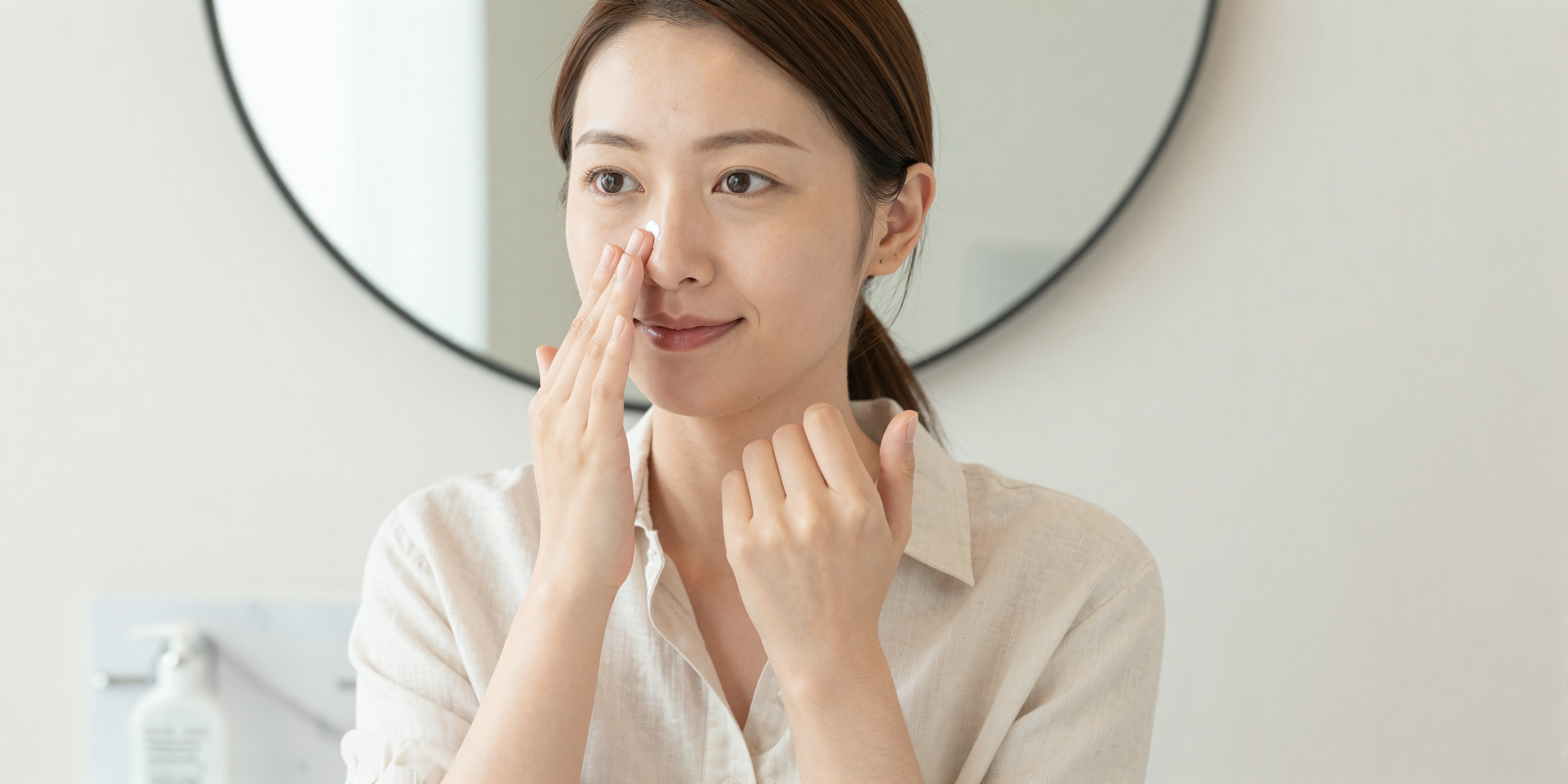 襟のボタンを外した薄手のリネンシャツを着た日本人女性が、優しく撫でるように鼻筋に日焼け止めを塗っている。彼女の表情は思慮深く、朝のスキンケアの儀式に集中しています。彼女は、大きな丸い鏡があり、自然光がたっぷりと降り注ぐ、明るくモダンなバスルームにいます。清潔な大理石のカウンタートップには、日焼け止めの入った小さな透明なガラス瓶が見えます。。高画質でフリーのNightStock素材です。商用利用可能・クレジット表記不要。
