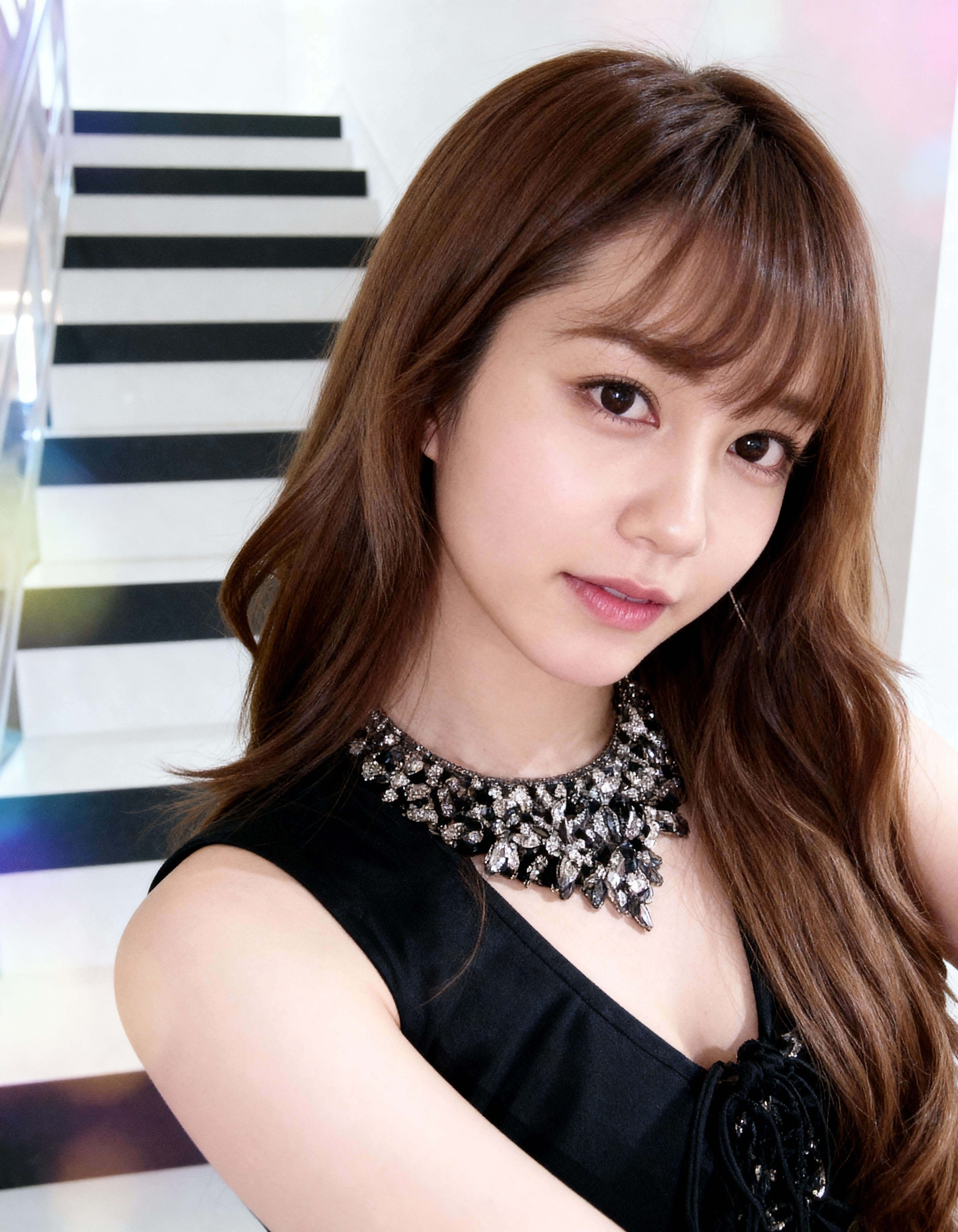 ウェーブのかかった茶色の長い髪を持ち、黒いノースリーブのドレスとステートメント ネックレスを身に着けている若い女性のポートレート。彼女は画像の中央に位置し、上半身がカメラに向かい、中立的な表情で視聴者をまっすぐに見つめています。女性は10代後半か20代前半のように見え、唇にわずかな笑みを浮かべ、茶色の目をしています。彼女の髪はゆるやかなウェーブに整えられ、背中に流れて顔を縁取ります。彼女はスリムな体をしており、露出した肩を露出する深く開いたネックラインの黒いドレスなど、最小限のジュエリーを身に着けています。背景には柔らかなぼかしカラーのストライプの階段が描かれており、モダンで洗練された雰囲気を醸し出しています。照明は柔らかく自然で、彼女の特徴を強調し、優雅さと洗練の感覚を作り出しています。全体的な効果は洗練された洗練されたもので、画像は洗練されたエレガントなポートレートを完璧に表現しています。