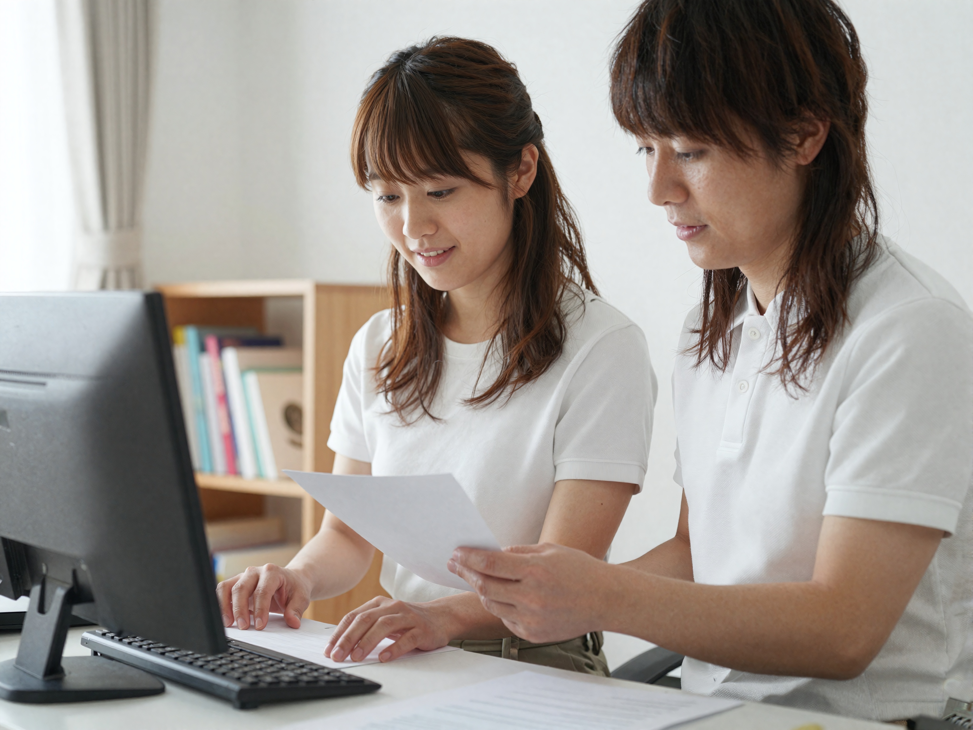 日本人男性が自宅オフィスのきちんとしたスタンディングデスクに立って、モニター上で書類やデジタルファイルを注意深く整理しています。彼は快適でありながらスマートなポロシャツを着ており、その表情は勤勉で組織的なものです。彼の後ろには、さまざまなタイトルで満たされた整理された本棚が見えます。近くの窓からの柔らかくて暖かい日光が整った空間を照らし、穏やかで生産的な雰囲気を作り出します。。高画質でフリーのNightStock素材です。商用利用可能・クレジット表記不要。